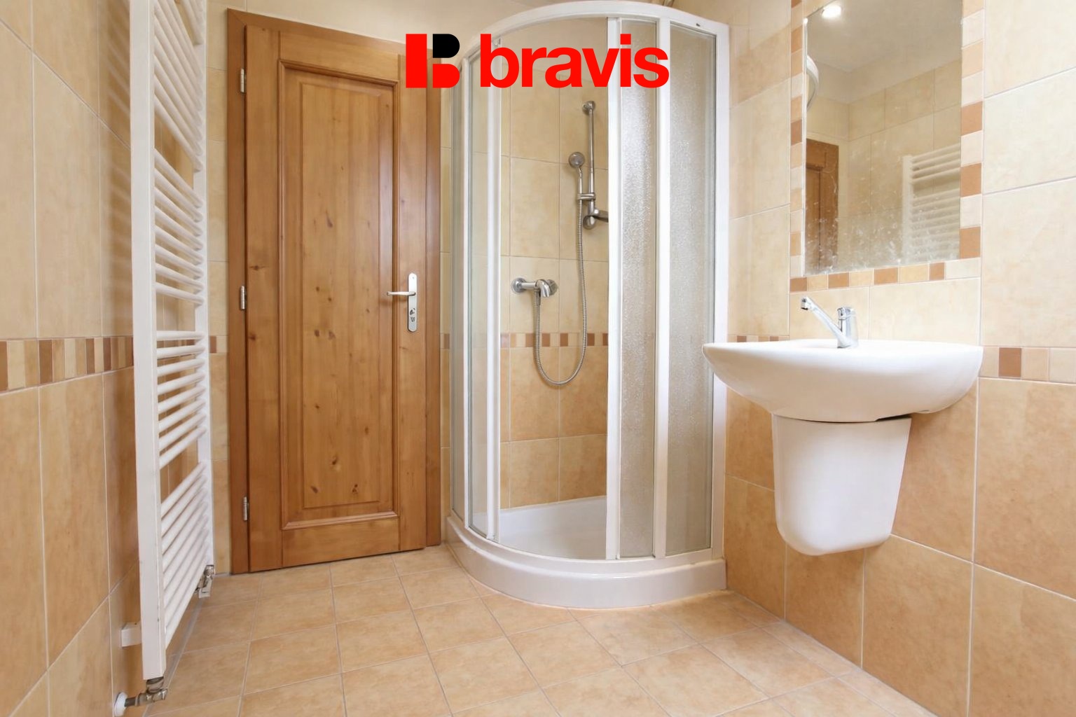 Koupelna je zařízena sprchovým koutem, umyvadlem, wc a přípojkou na pračku.