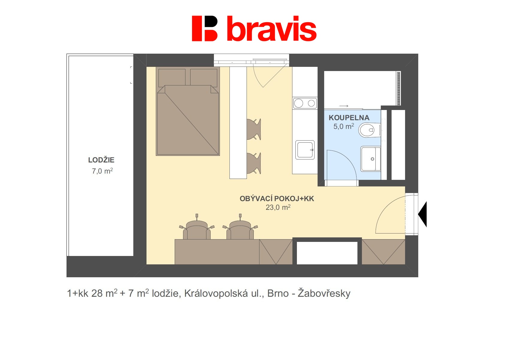 • Lodžie: Rozšiřuje obytný prostor o venkovní posezení se stolkem a dvěma židlemi, ideální pro večerní drink.