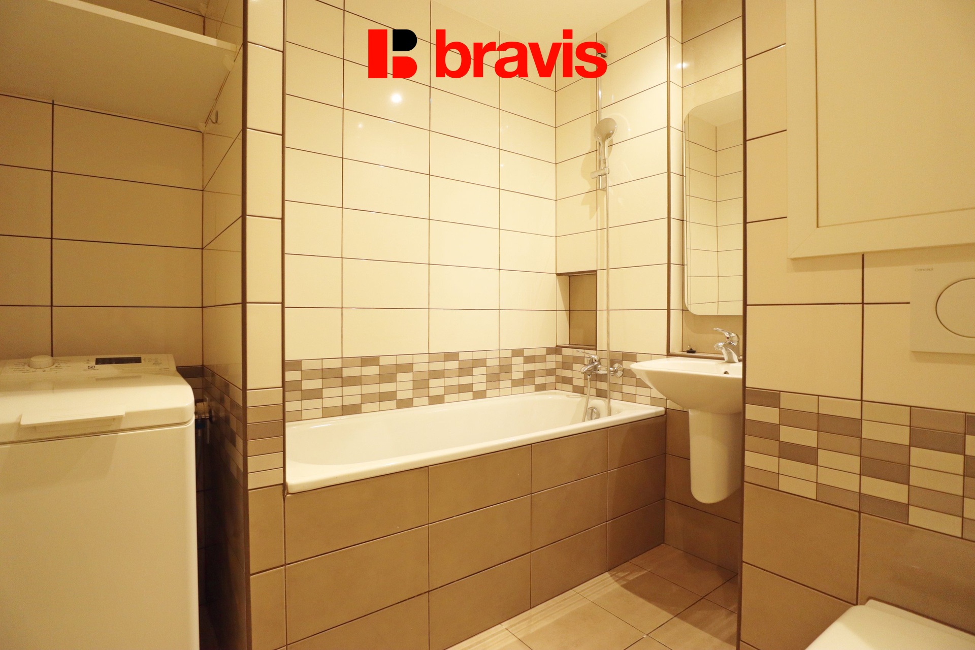 Zařízení koupelny tvoří vana, umyvadlo, toaleta a pračka.