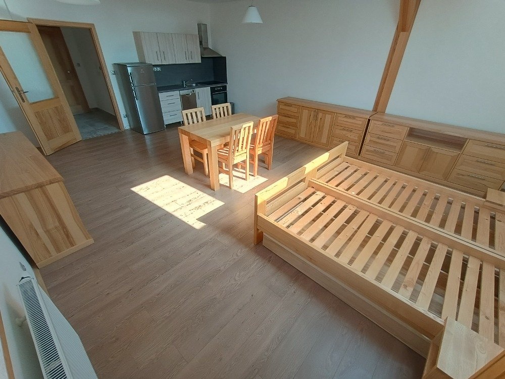 Dovolujeme si Vám nabídnout velice krásný a prostorný byt 1kk v kompletně udělané budově včetně daného bytu .Byt s výměrou 44m2 se pronajímá částečně zařízený viz foto A JE KRÁSNĚ A NOVĚ UDĚLÁN. Všechen nábytek je z masivu a byl udělán přímo a konkrétně na tento byt. K bytu je možno využívat parkovací místo a zahradu. Nájemné 12 900kč+ 3000kč služby včetně energií + kauce a provize RK