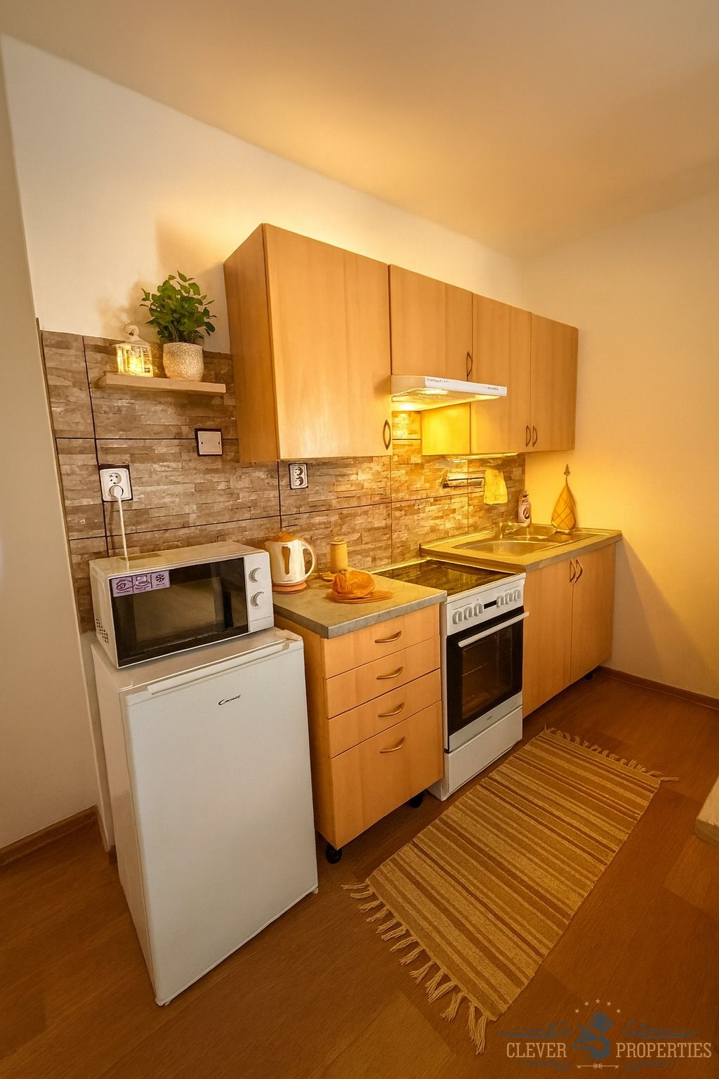 Součástí bytu je plně vybavená kuchyňská linka včetně sporáku, mikrovlnné trouby a lednice. Koupelna disponuje sprchovým koutem.