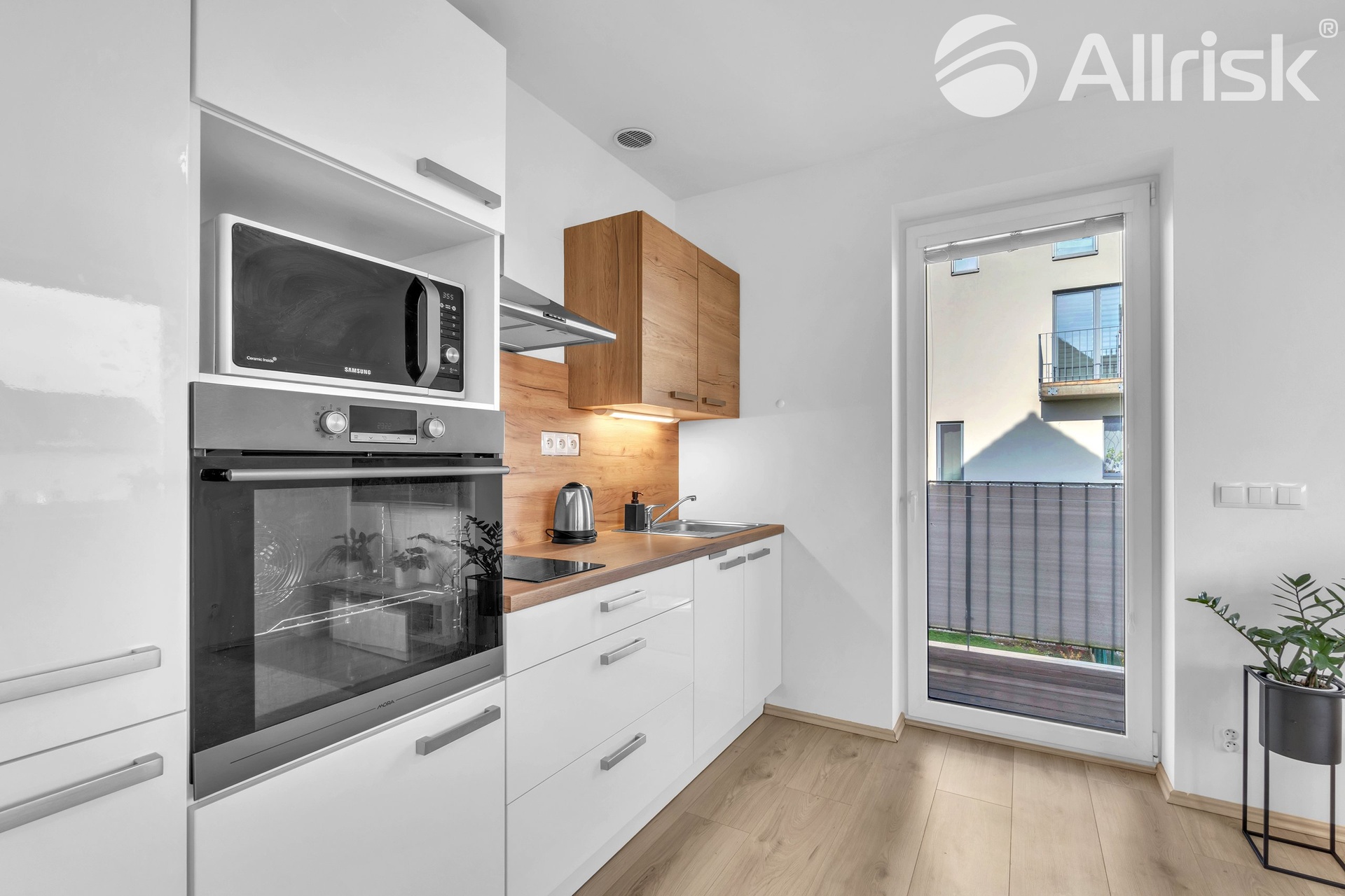 Vybavení bytu - kuchyňská linka včetně vestavěné lednice s mrazákem, trouba, dvouplotýnka indukce, digestoř a vestavěná skříň na chodbě.