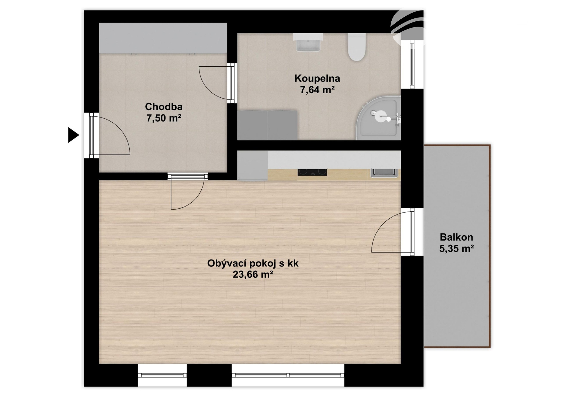 Byt s balkonem se nachází v 1. patře novostavby z roku 2023, v domě není výtah (není tedy bezbariérový). Součástí je i sklepní kóje v přízemí (cca 5,7 m² ) a jedno venkovní parkovací stání přímo vyhrazené pro bytovou jednotku.