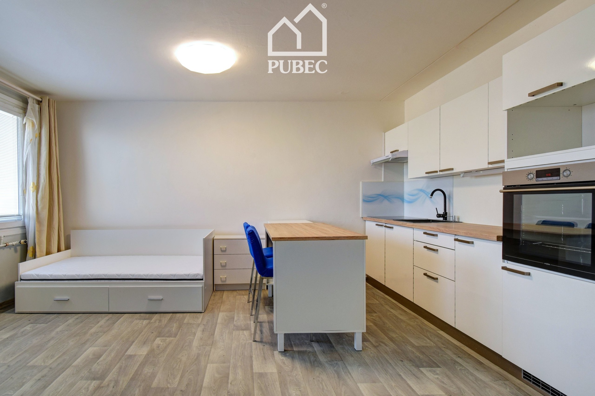 Byt je prakticky řešený a částečně vybavený. V předsíni se nachází vestavěná skříň, která nabízí dostatek úložného prostoru. Hlavní obytná místnost je spojena s kuchyňským koutem, kde je k dispozici kuchyňská linka vybavená troubou, varnou deskou, myčkou nádobí a lednicí s mrazákem. Součástí vybavení je také rozkládací postel. Koupelna je vybavena pračkou, což zvyšuje komfort bydlení.