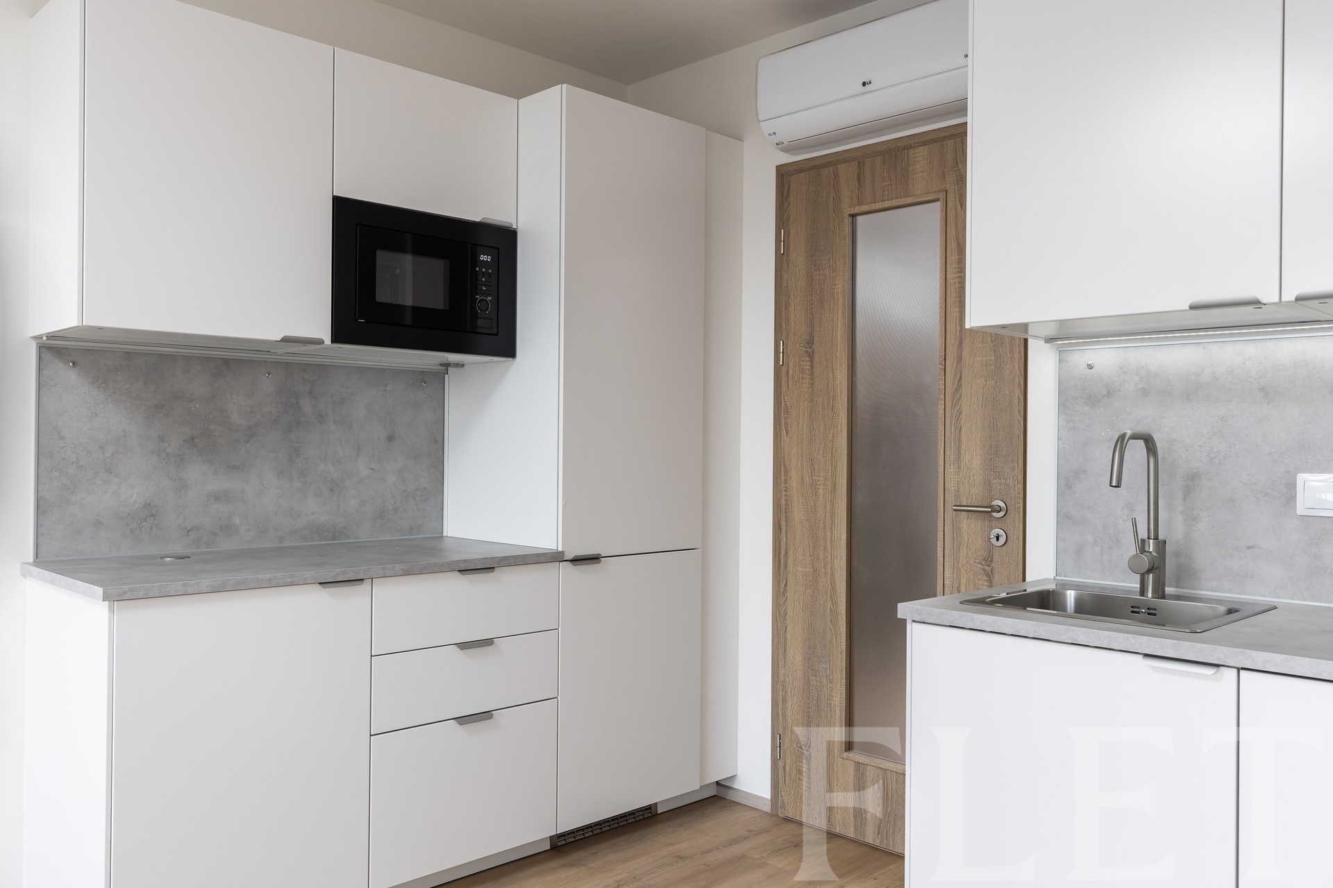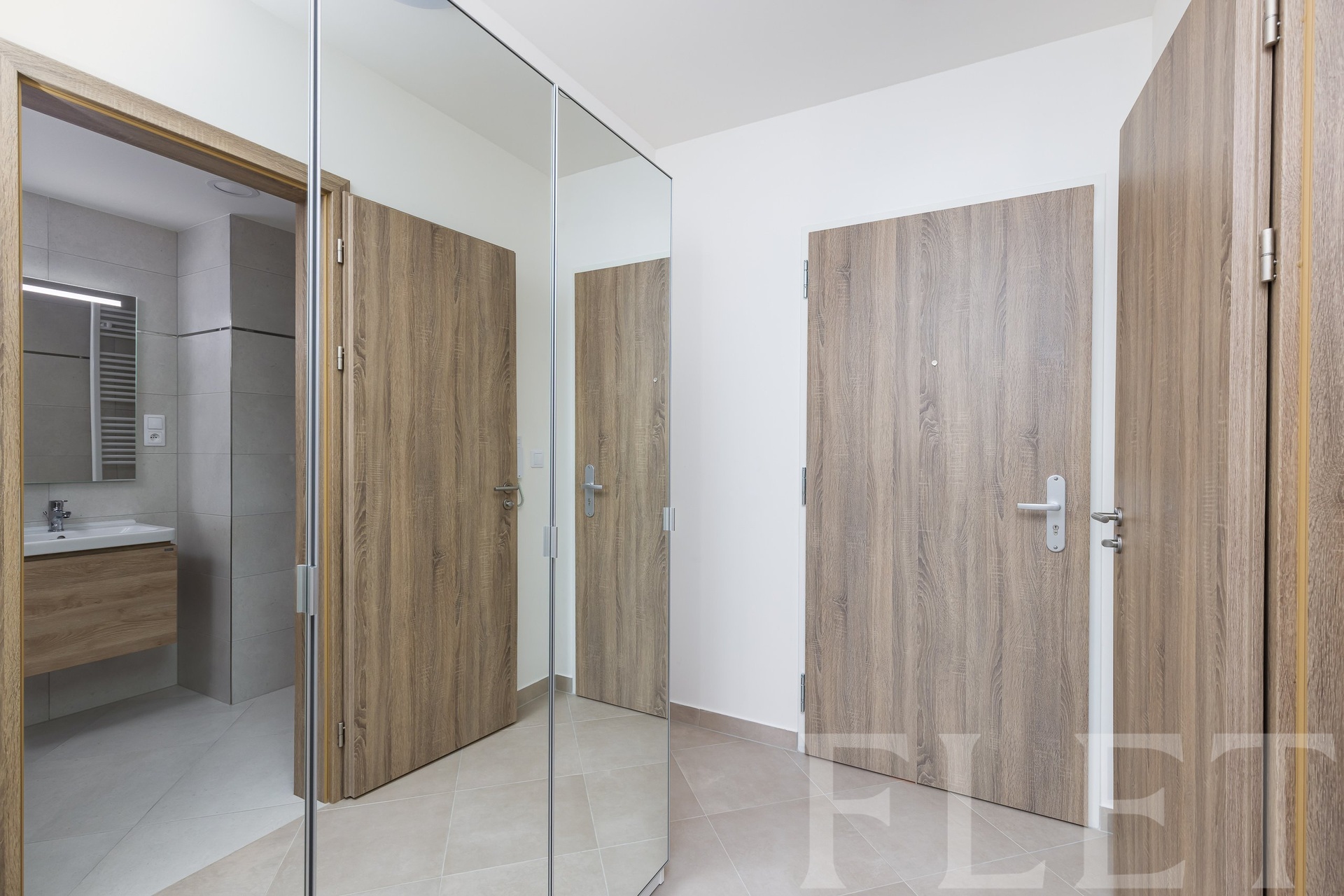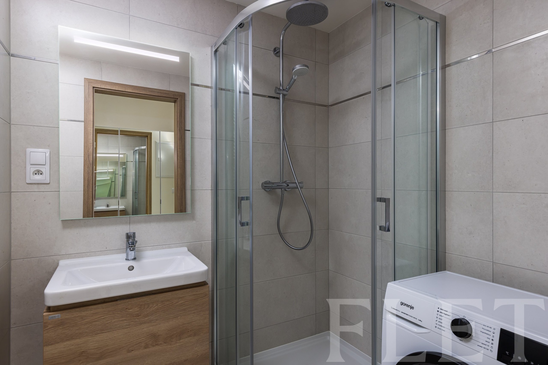 Součástí koupelny se sprchovým koutem a toaletou je také pračka. Byt je vybaven moderním systémem větrání s rekuperací tepla i klimatizací. V předsíni je připravena zrcadlová skříň, která zajišťuje dostatek úložného prostoru pro vaše osobní věci. Součástí pronájmu je také sklepní kóje a parkovací stání přímo v domě.