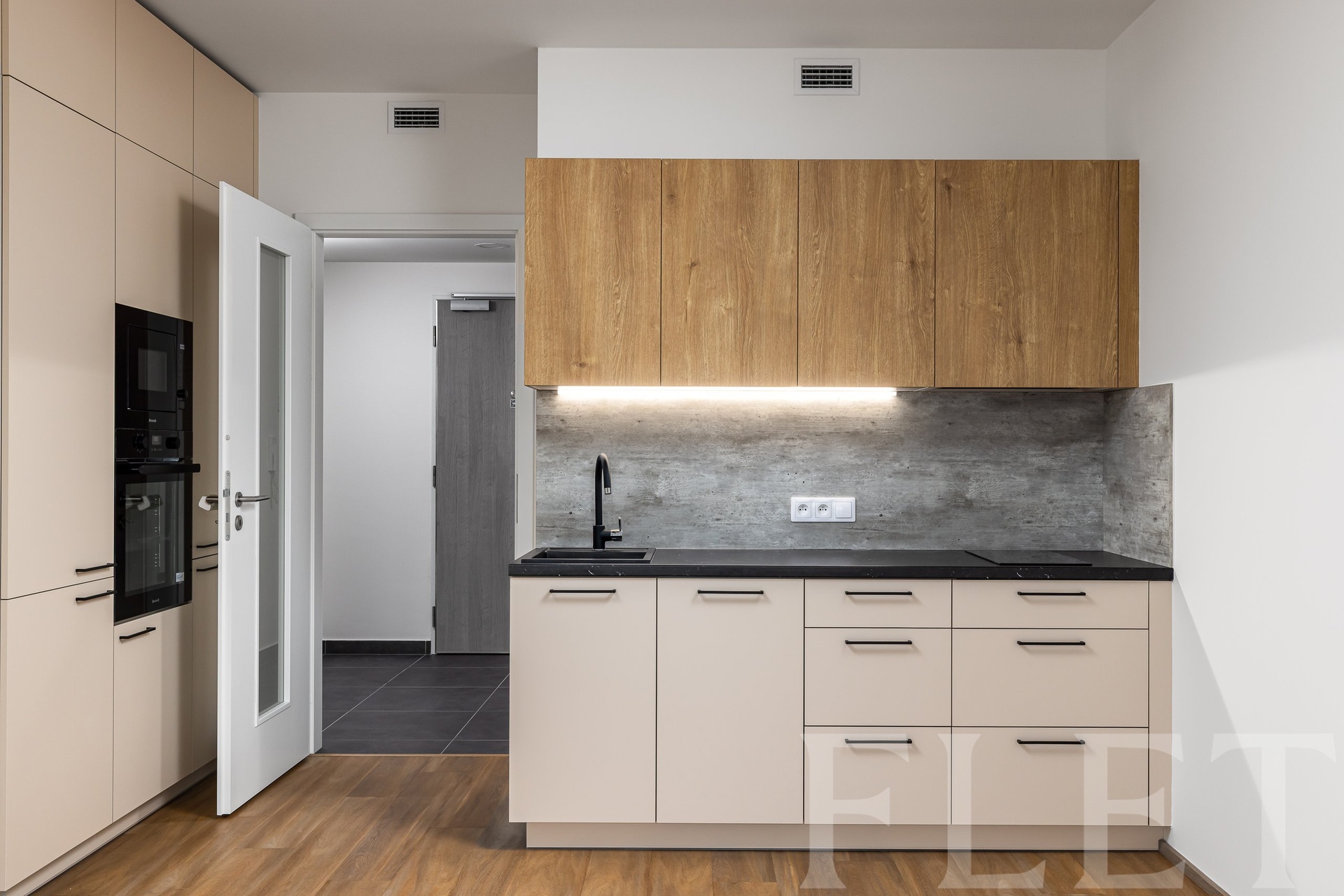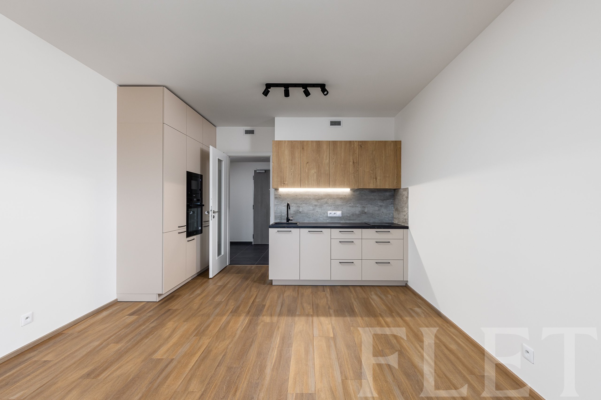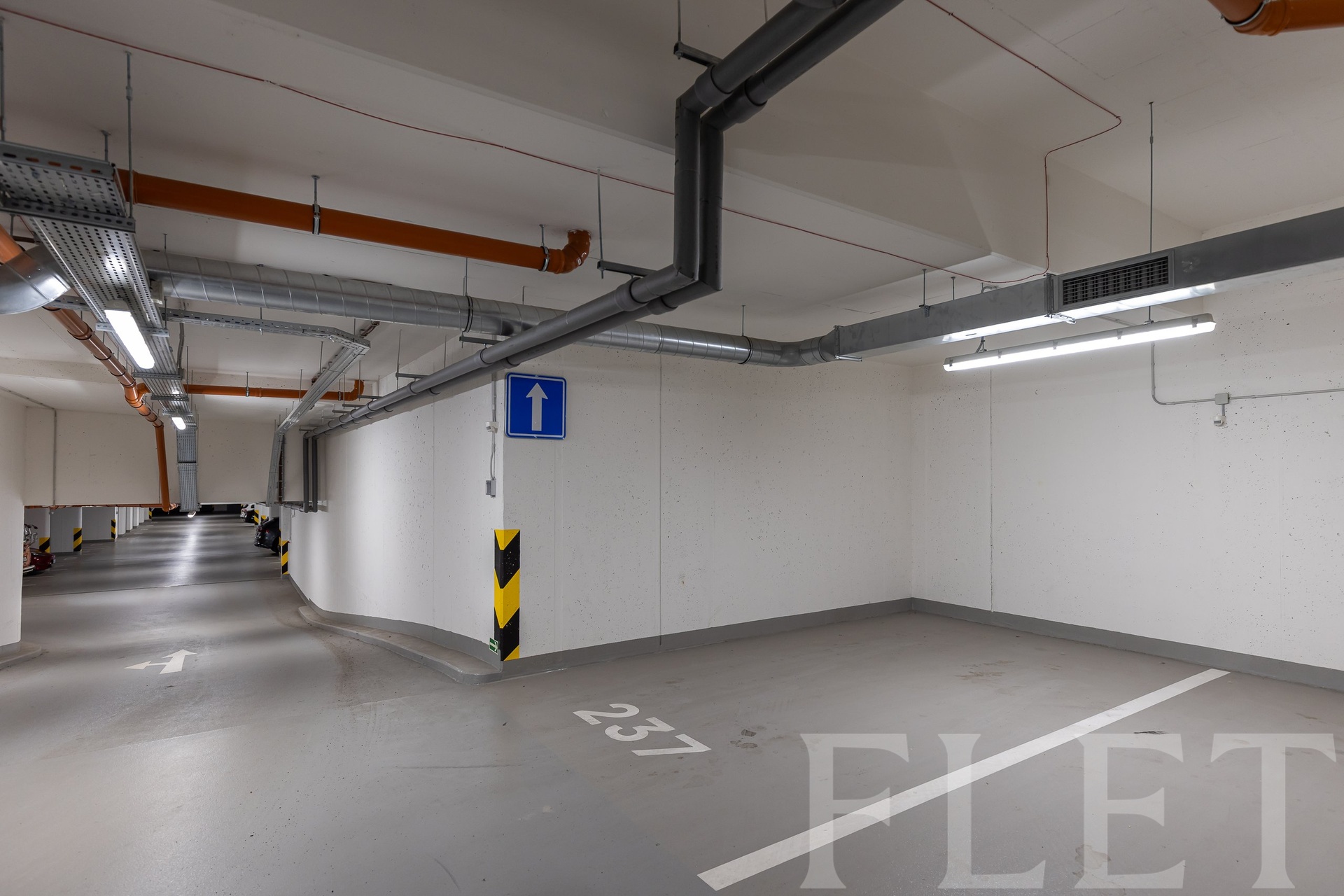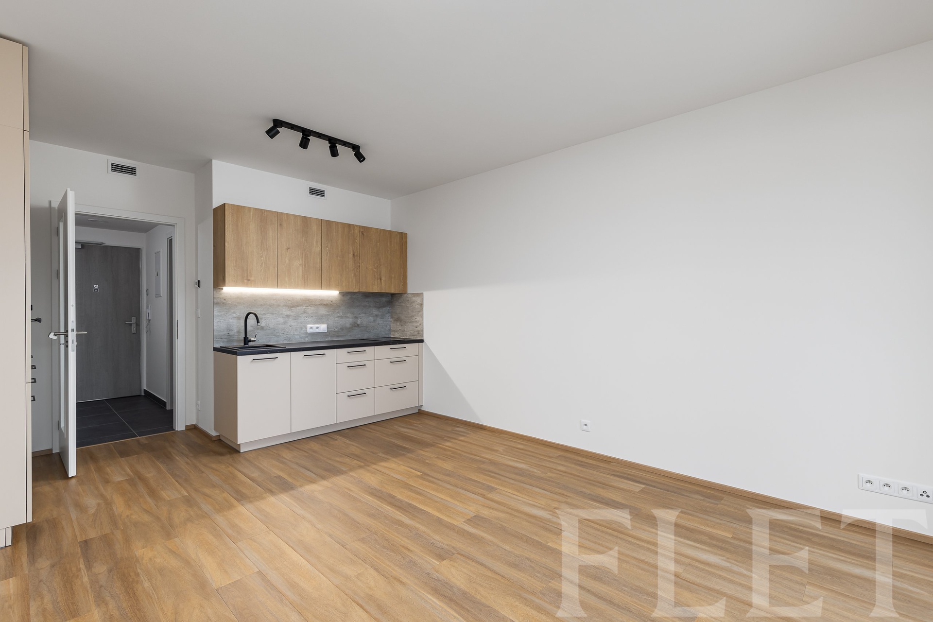 Při dispozici 1+kk nabízí prostorná hlavní místnost s moderním kuchyňským koutem, vybaveným elektrickou i mikrovlnnou troubou, myčkou nádobí a vestavěnou lednicí s mrazákem. Z předsíně je vstup do elegantní koupelny se sprchovým koutem, toaletou a pračkou. Byt dále disponuje sklepem, který poskytuje dodatečné úložné prostory, a parkovacím stáním v garážích domu.