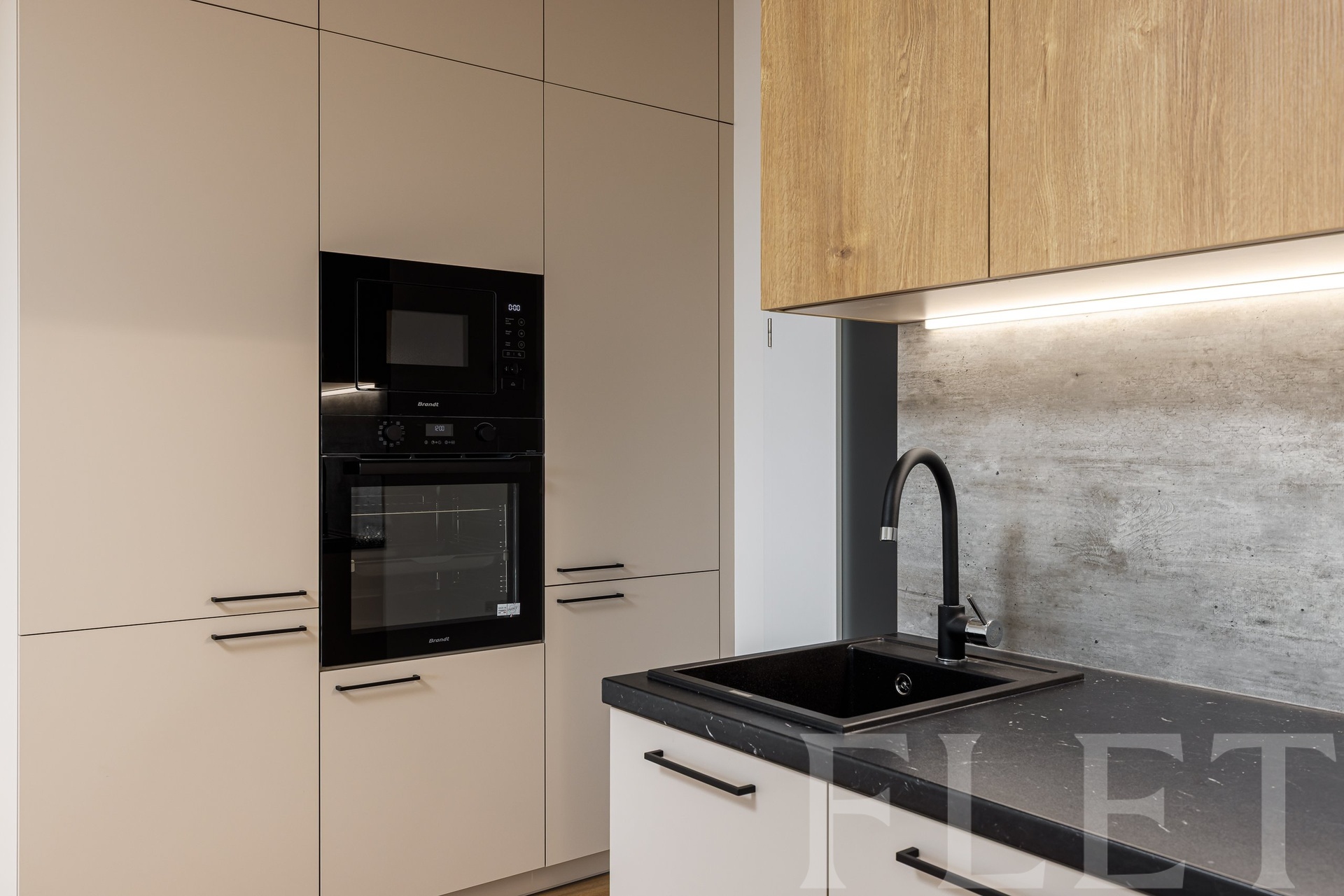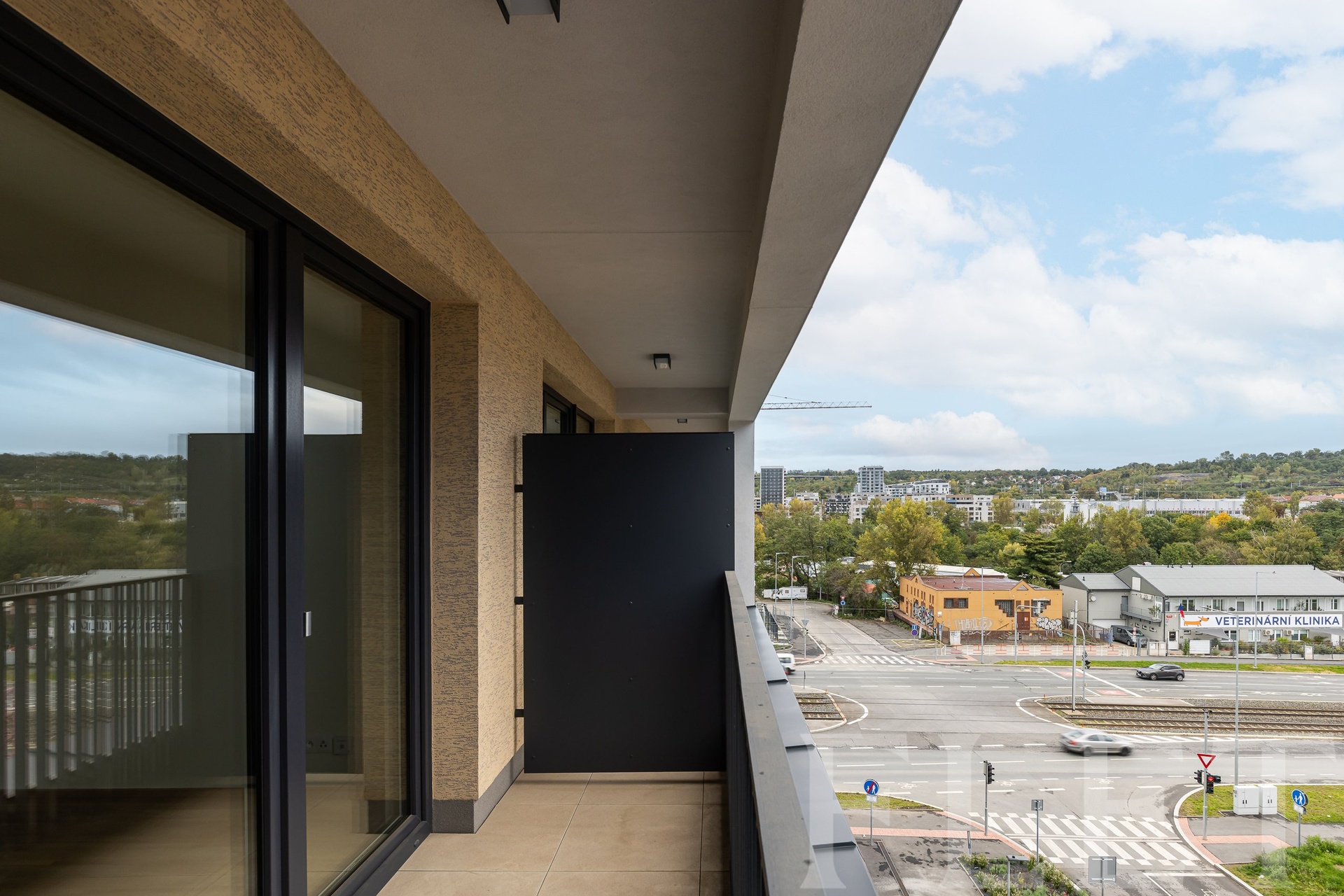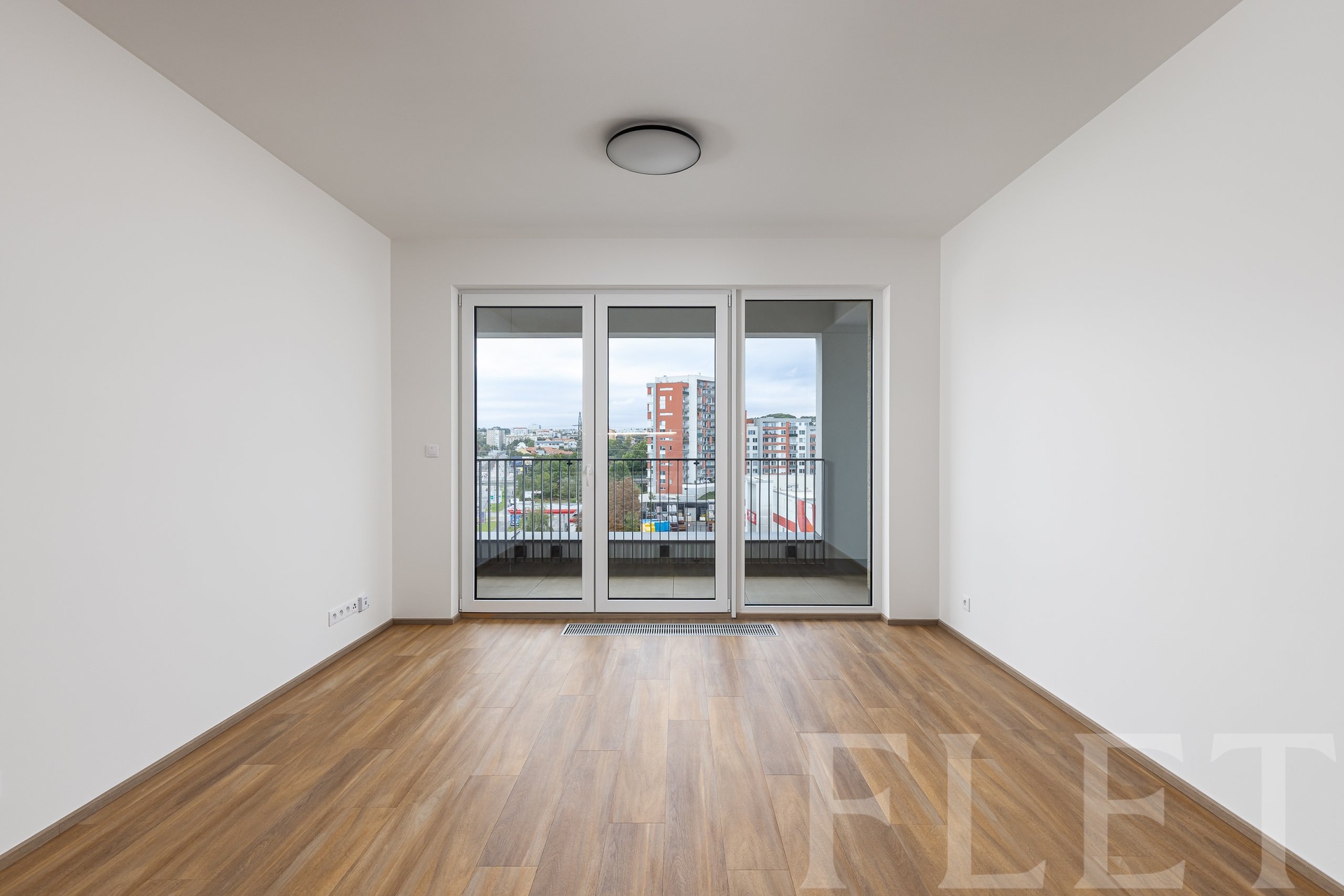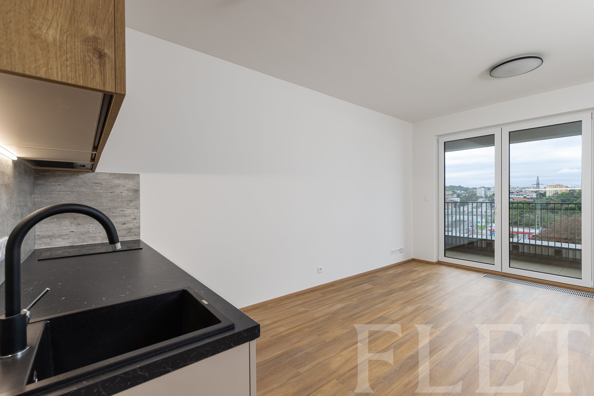 Při dispozici 1+kk nabízí prostorná hlavní místnost s moderním kuchyňským koutem, vybaveným elektrickou i mikrovlnnou troubou, myčkou nádobí a vestavěnou lednicí s mrazákem. Z předsíně je vstup do elegantní koupelny se sprchovým koutem, toaletou a pračkou. Byt dále disponuje sklepem, který poskytuje dodatečné úložné prostory, a parkovacím stáním v garážích domu.