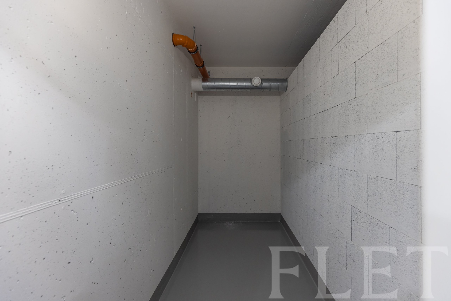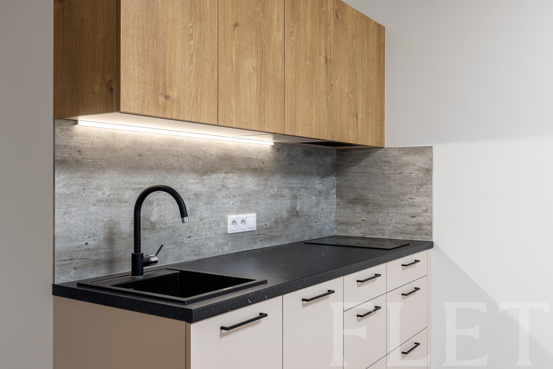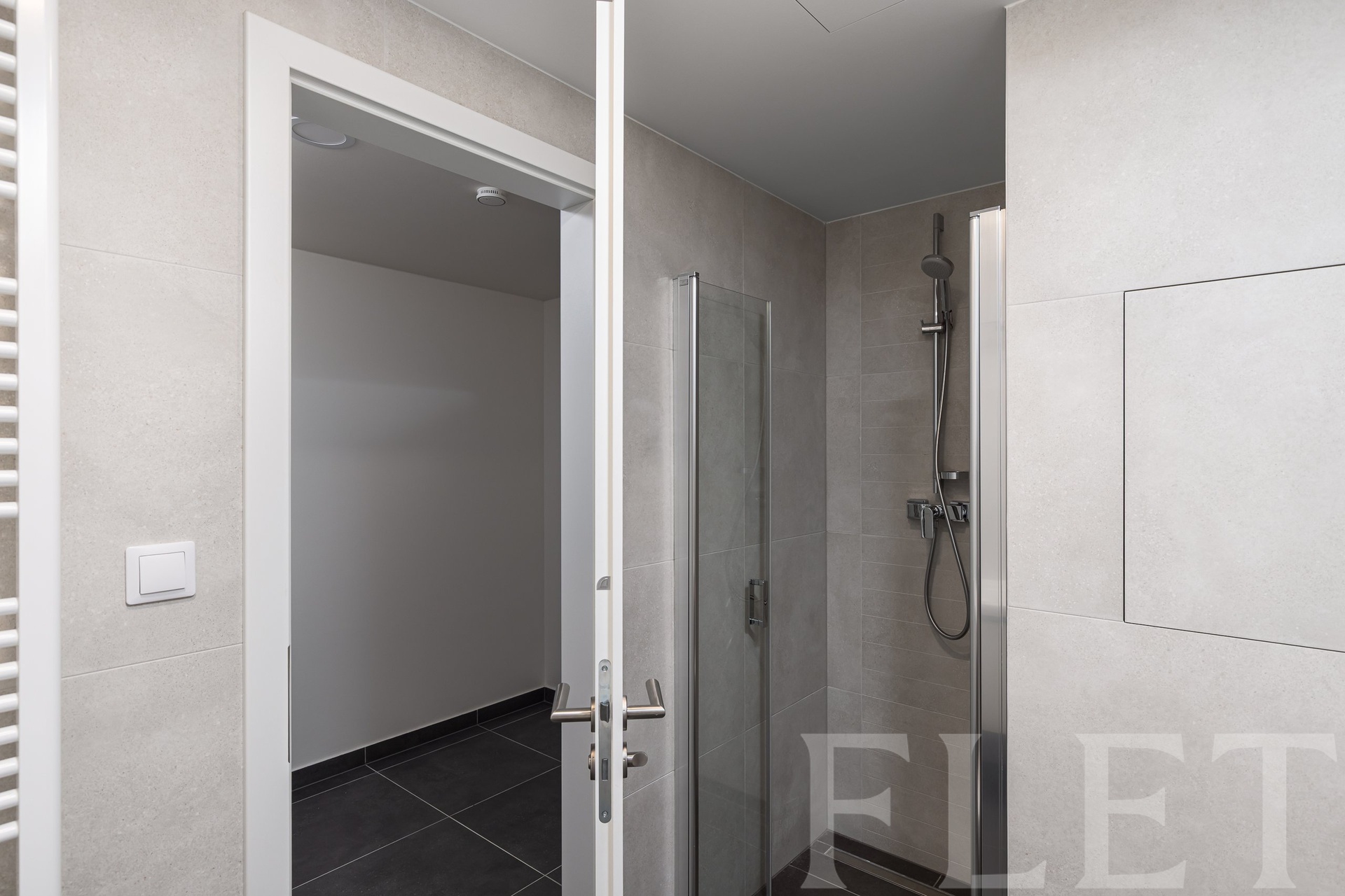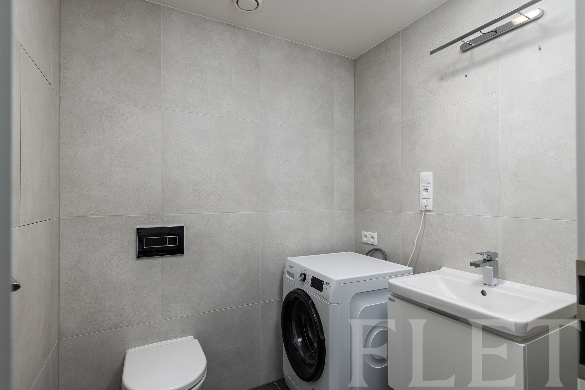 Při dispozici 1+kk nabízí prostorná hlavní místnost s moderním kuchyňským koutem, vybaveným elektrickou i mikrovlnnou troubou, myčkou nádobí a vestavěnou lednicí s mrazákem. Z předsíně je vstup do elegantní koupelny se sprchovým koutem, toaletou a pračkou. Byt dále disponuje sklepem, který poskytuje dodatečné úložné prostory, a parkovacím stáním v garážích domu.