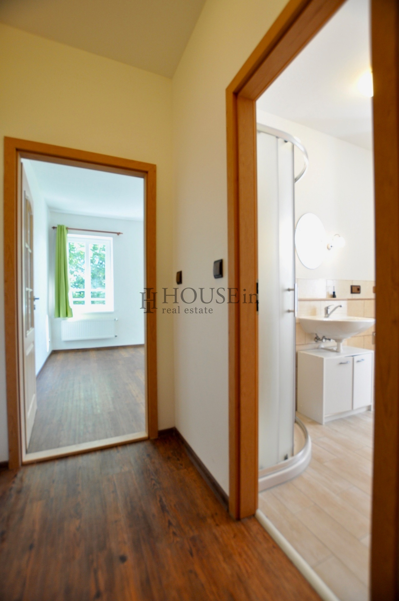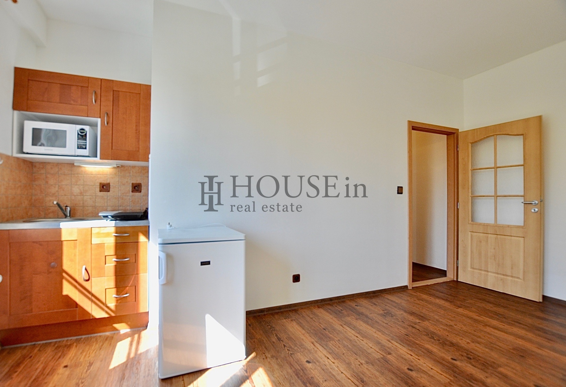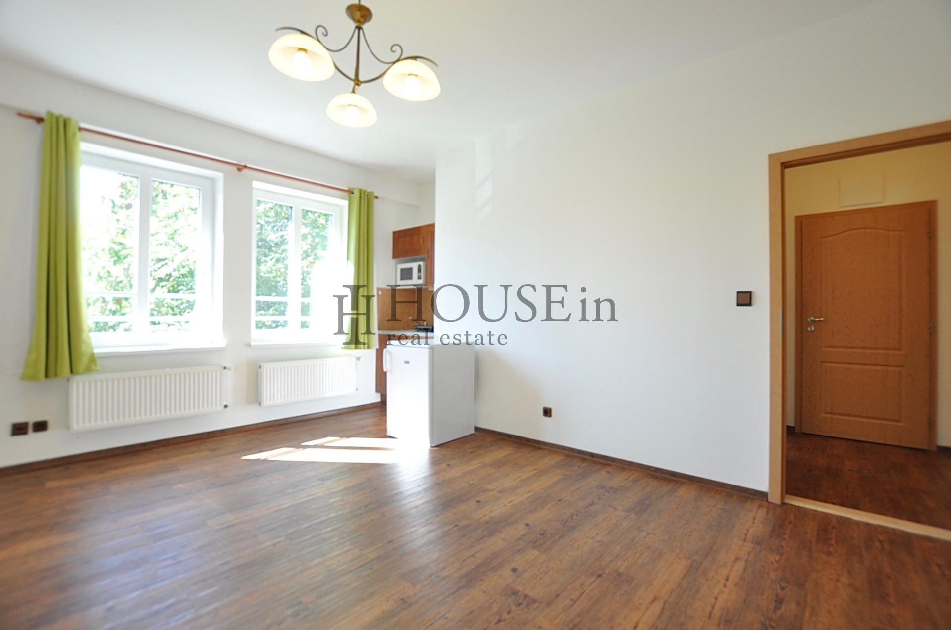 Byt nabízí předsíň, koupelnu se sprchovým koutem a toaletou a prosvětlenou obytnou místnost s kuchyňským koutem orientovanou do klidné zahrady. Kuchyňská linka je vybavena indukční varnou deskou, lednicí s mrazákem a mikrovlnnou troubou s grilem. Internet je již zahrnut v ceně nájmu.