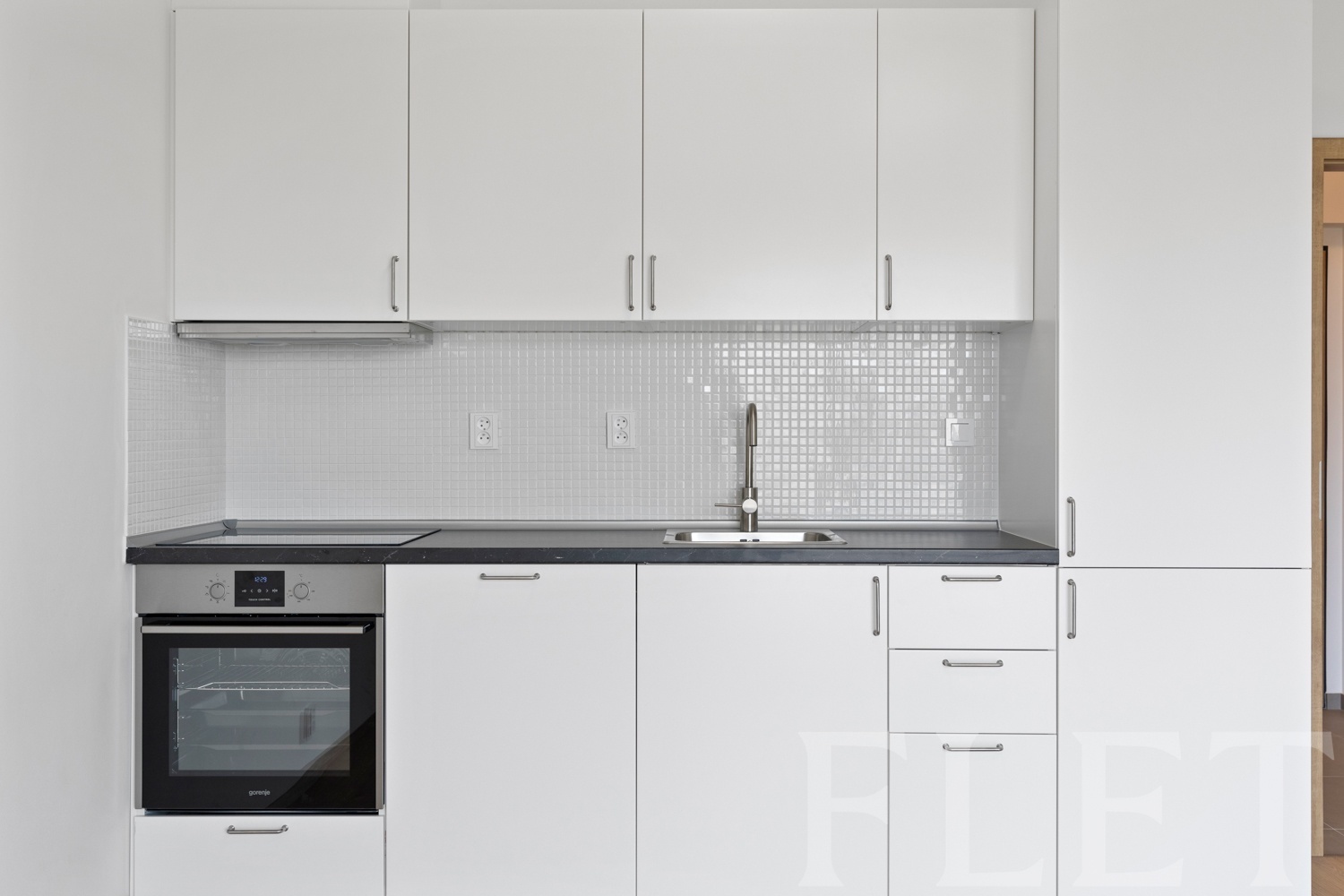 Kuchyně s obývací částí je díky velkému francouzskému oknu krásně prosvětlená, což prostoru dodává vzdušnost a příjemnou atmosféru po celý den. Moderní kuchyňská linka nabízí dostatek úložných prostor a poskytuje komfort pro každodenní vaření. V prostorné koupelně najdete sprchový kout, toaletu a pračku.