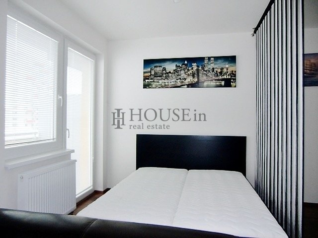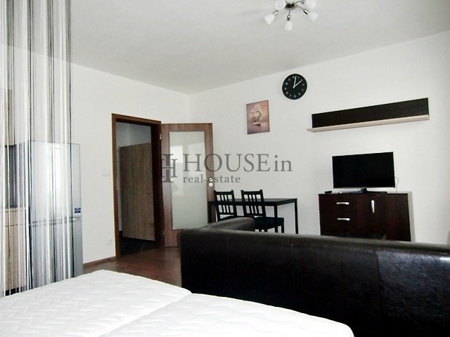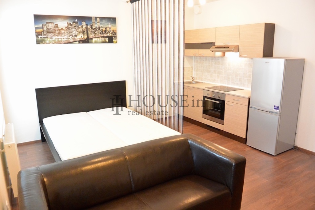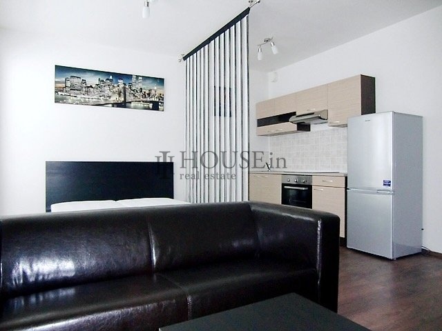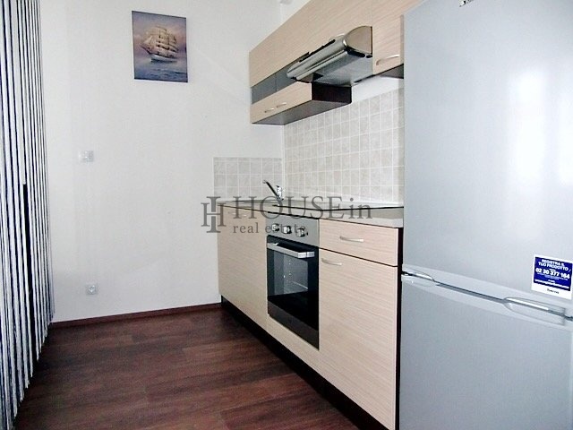 Dispozice bytu: vstupní předsíň s úložnou skříní, koupelna se sprchovým koutem, WC a pračkou, obytná místnost s kompletně vybavenou kuchyňskou linkou (elektrická trouba, sklokeramická varná deska, velká lednice s mrazákem, digestoř) a vstupem na prostorný balkón. Byt je pronajímán včetně veškerého nábytku a spotřebičů. Součástí je také velký zděný sklep umístěný na patře. K dispozici jsou bezpečnostní dveře, protipožární systém, žaluzie a možnost vysokorychlostního internetu.
