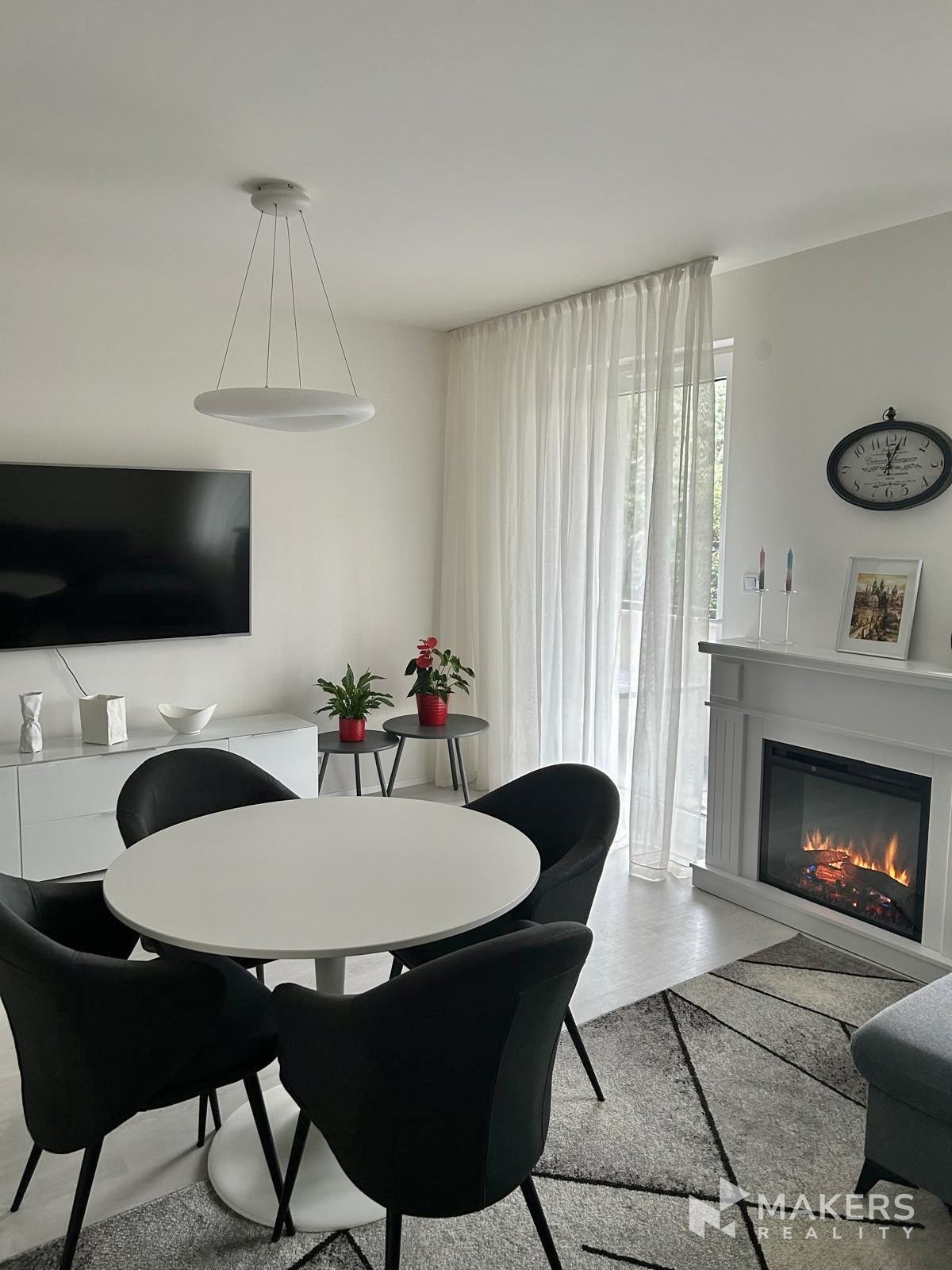 Interiér bytu je promyšleně řešený a nabízí vše potřebné pro pohodlné bydlení. Otevřený obytný prostor je vybaven moderní kuchyňskou linkou se spotřebiči – elektrickou troubou, myčkou, varnou deskou, lednicí, rychlovarnou konvicí. Součástí je také jídelní kout se stolem a čtyřmi židlemi, pohodlná rohová rozkládací sedačka, televize a stylový elektrický krb, který interiéru dodává útulnou atmosféru.
