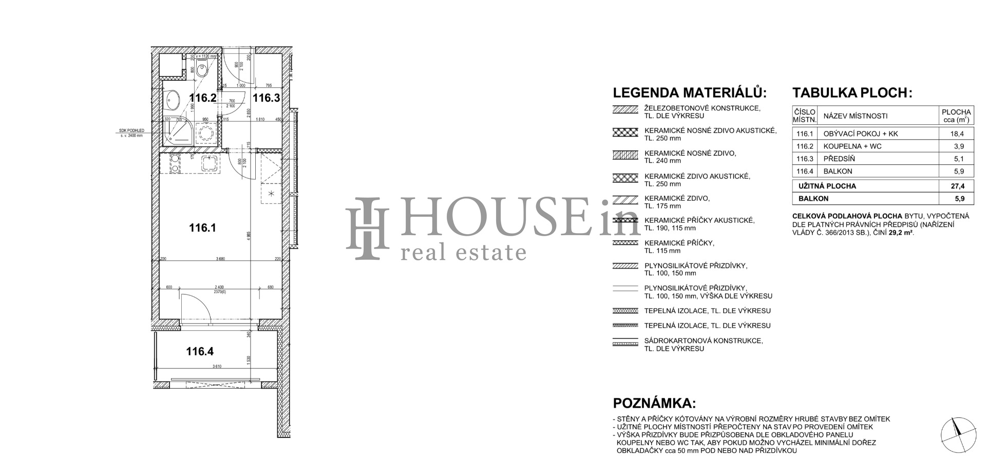 Dispozičně byt nabízí předsíň s velkou vestavěnou skříní, koupelnu se sprchovým koutem, WC a pračkou a hlavní obytnou místnost s vybavenou kuchyňskou linkou. Ta je osazena spotřebiči: myčka, trouba, sklo-keramická varná deska, digestoř, lednice s mrazákem a mikrovlnná trouba. Z obytné části je vstup na prostornou lodžii s výhledem do zeleného údolí.
