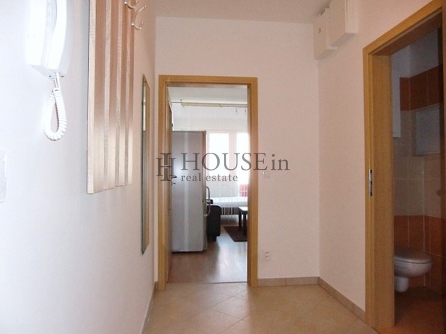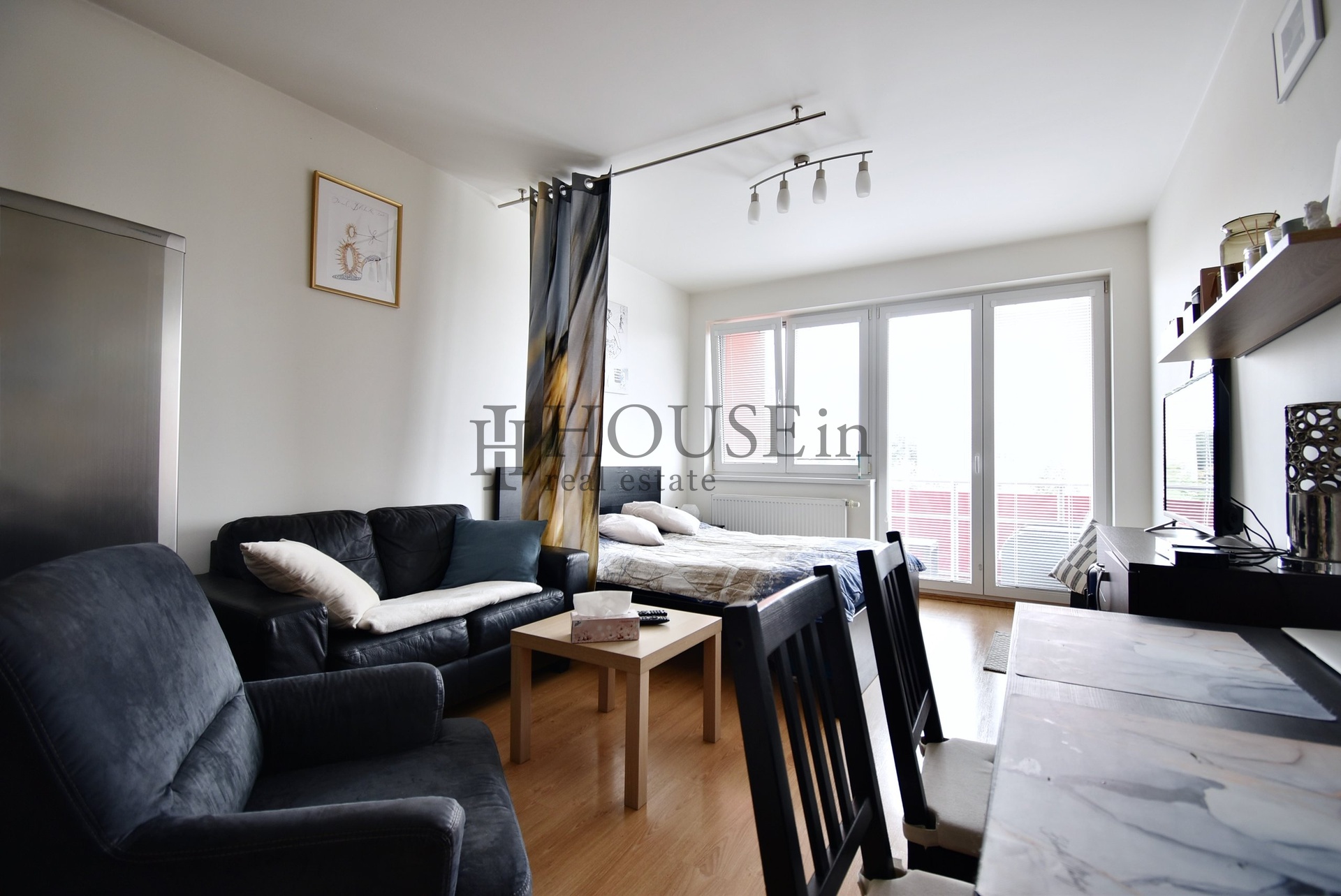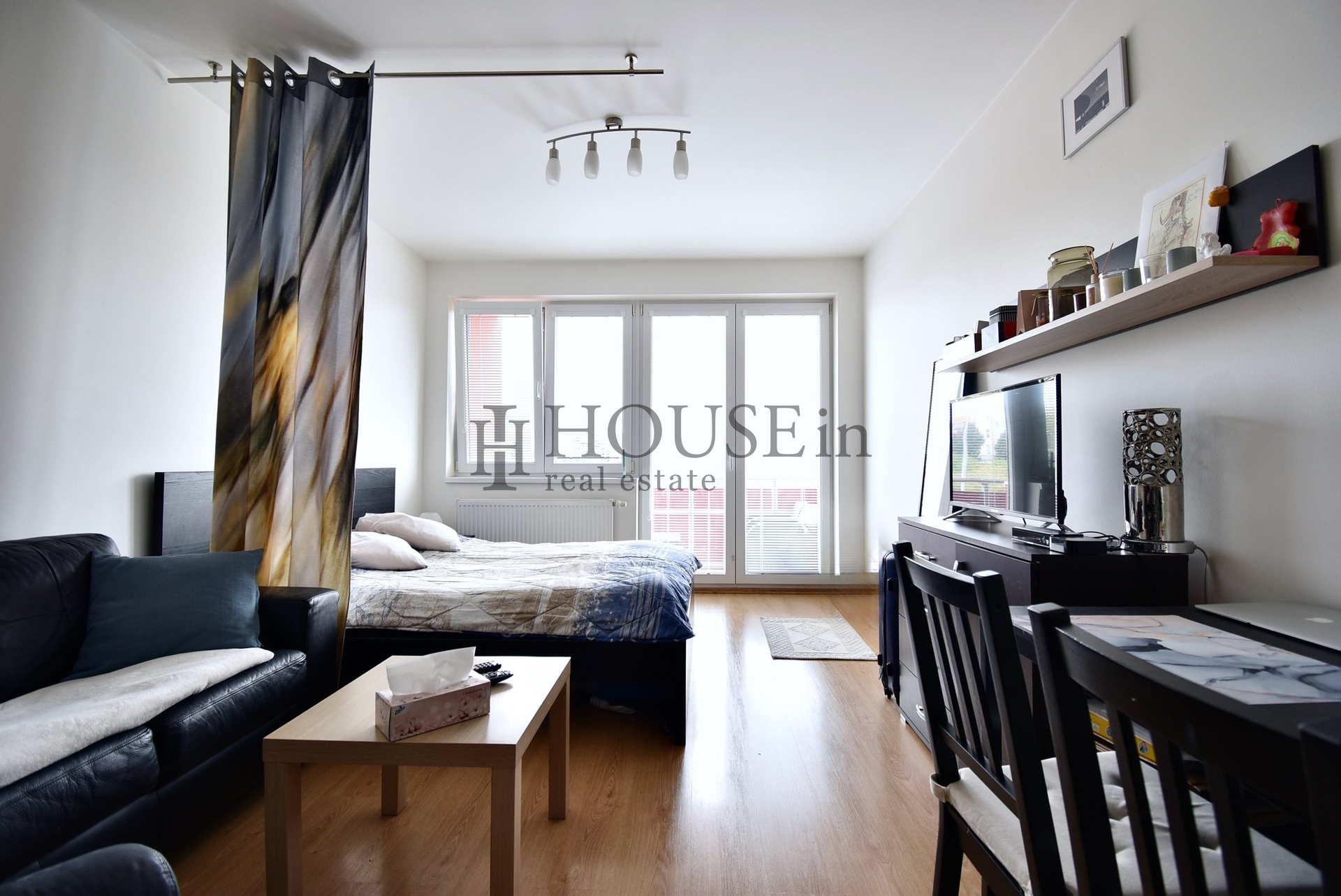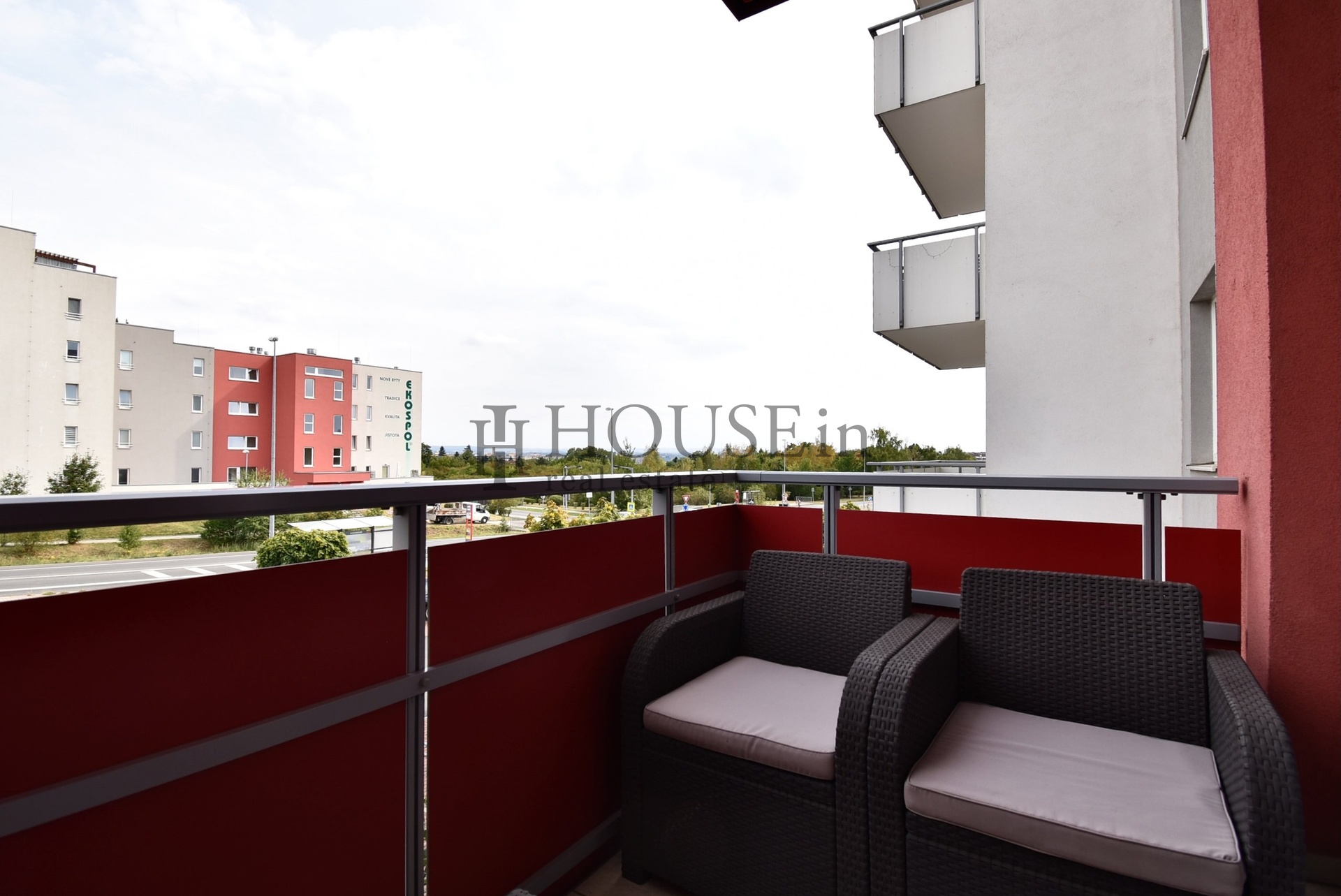 Dispozice bytu zahrnuje předsíň, koupelnu se sprchovým koutem a toaletou, a světlý obytný pokoj s kuchyňskou linkou a vstupem na balkón. Byt je kompletně vybaven nábytkem a spotřebiči – k dispozici je lednice, elektrická trouba, varná deska, digestoř, pračka i televize.