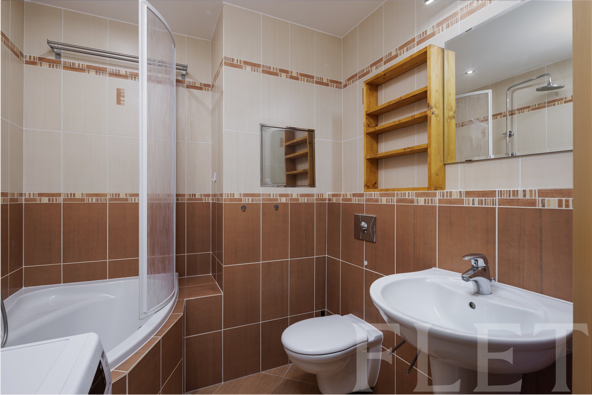 V hlavní, krásně prosvětlené místnosti budete mít dostatek místa pro obývací i jídelní část. Její součástí je kuchyňský kout vybavený spotřebiči, jako je elektrická trouba, varná deska, digestoř i lednice. Okna jsou orientována na západ a výhled budete mít do klidného okolí. Součástí koupelny s vanou a toaletou je také pračka.