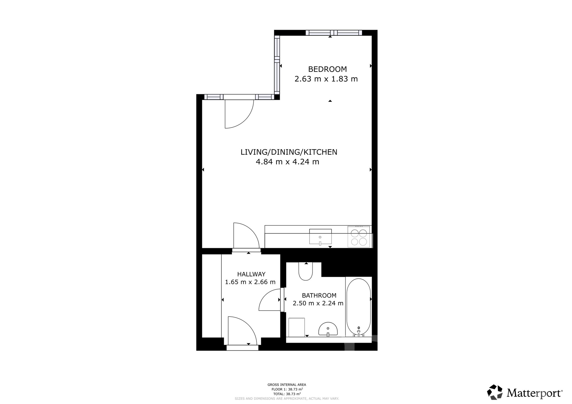 Obytný prostor je chytře propojen s kuchyňským koutem a nabízí vše potřebné pro pohodlné bydlení. K dispozici je postel, sedačka, televizní stolek s televizí i jídelní stůl se dvěma židlemi. Kuchyňská linka je vybavena varnou deskou, troubou a mikrovlnnou troubou. V koupelně se nachází vana, toaleta a pračka. V předsíni je prostorná skříň, která poskytuje dostatek úložného prostoru.
