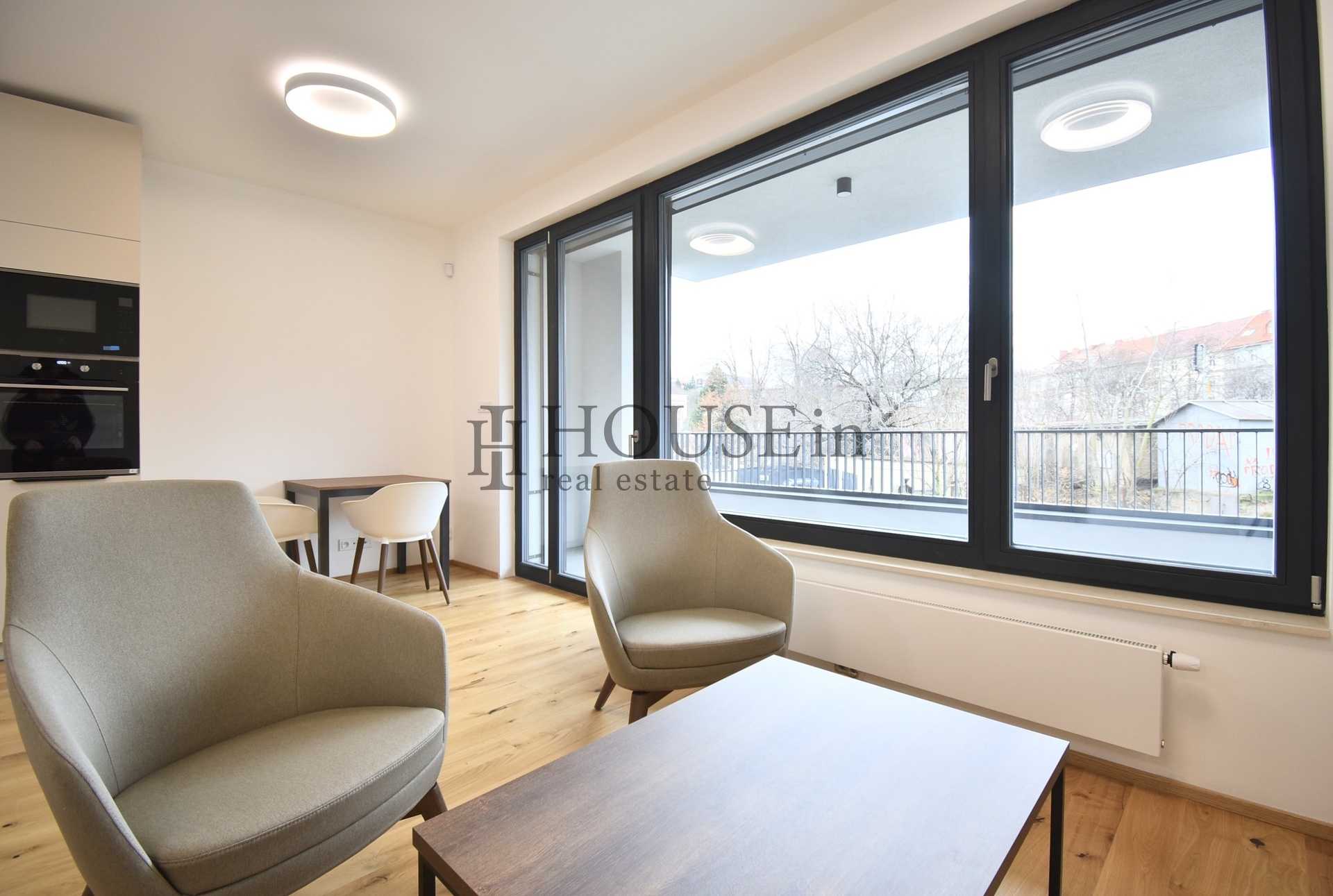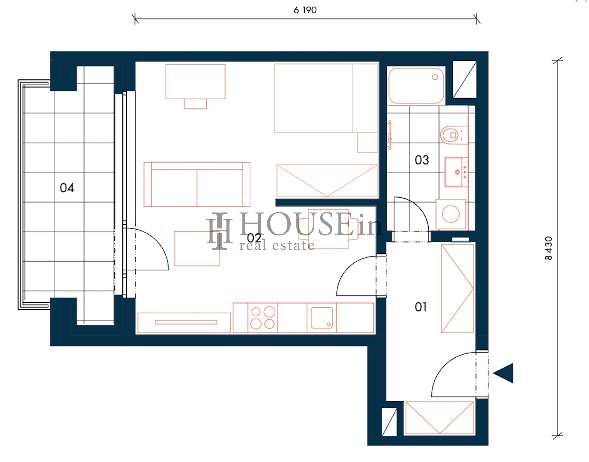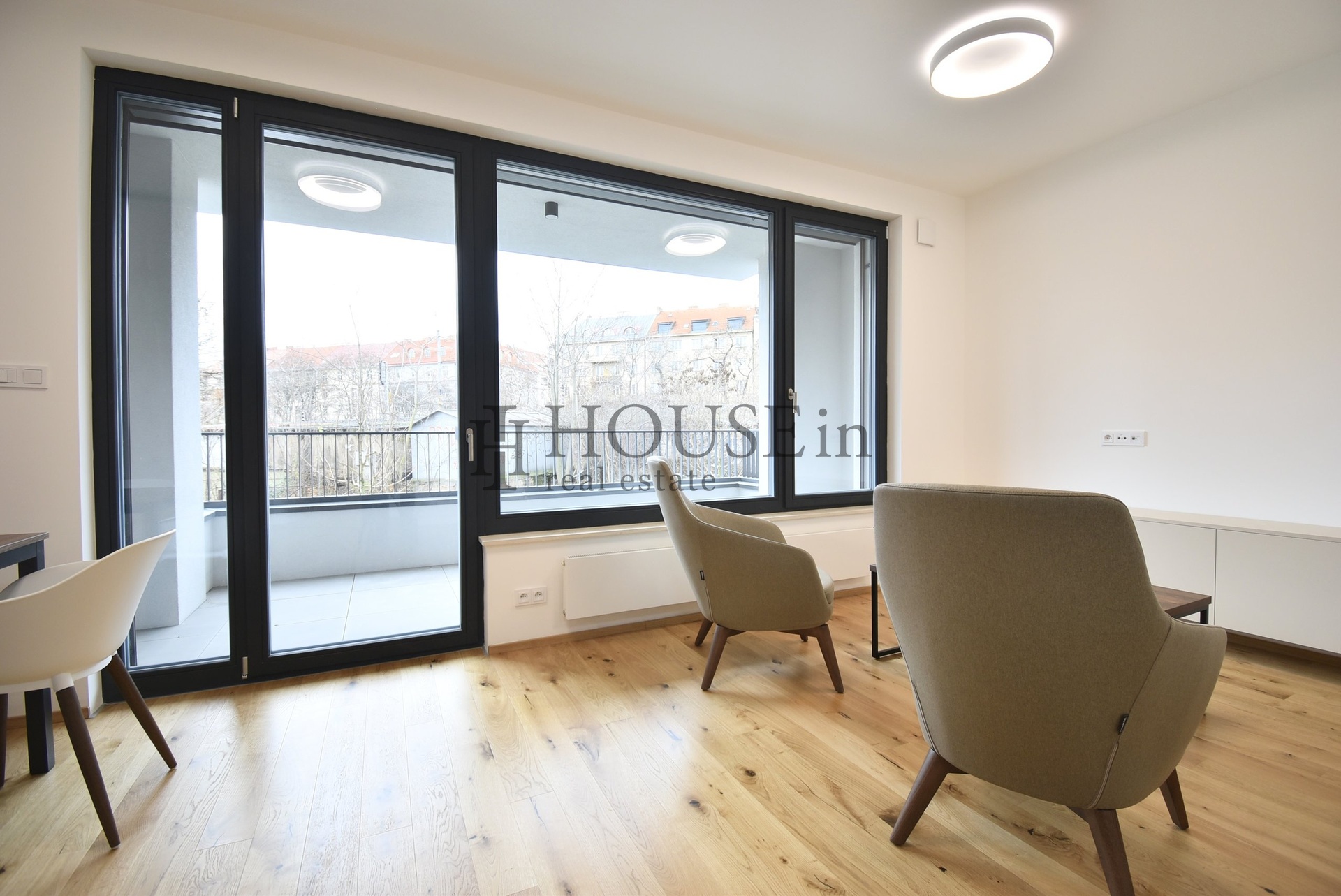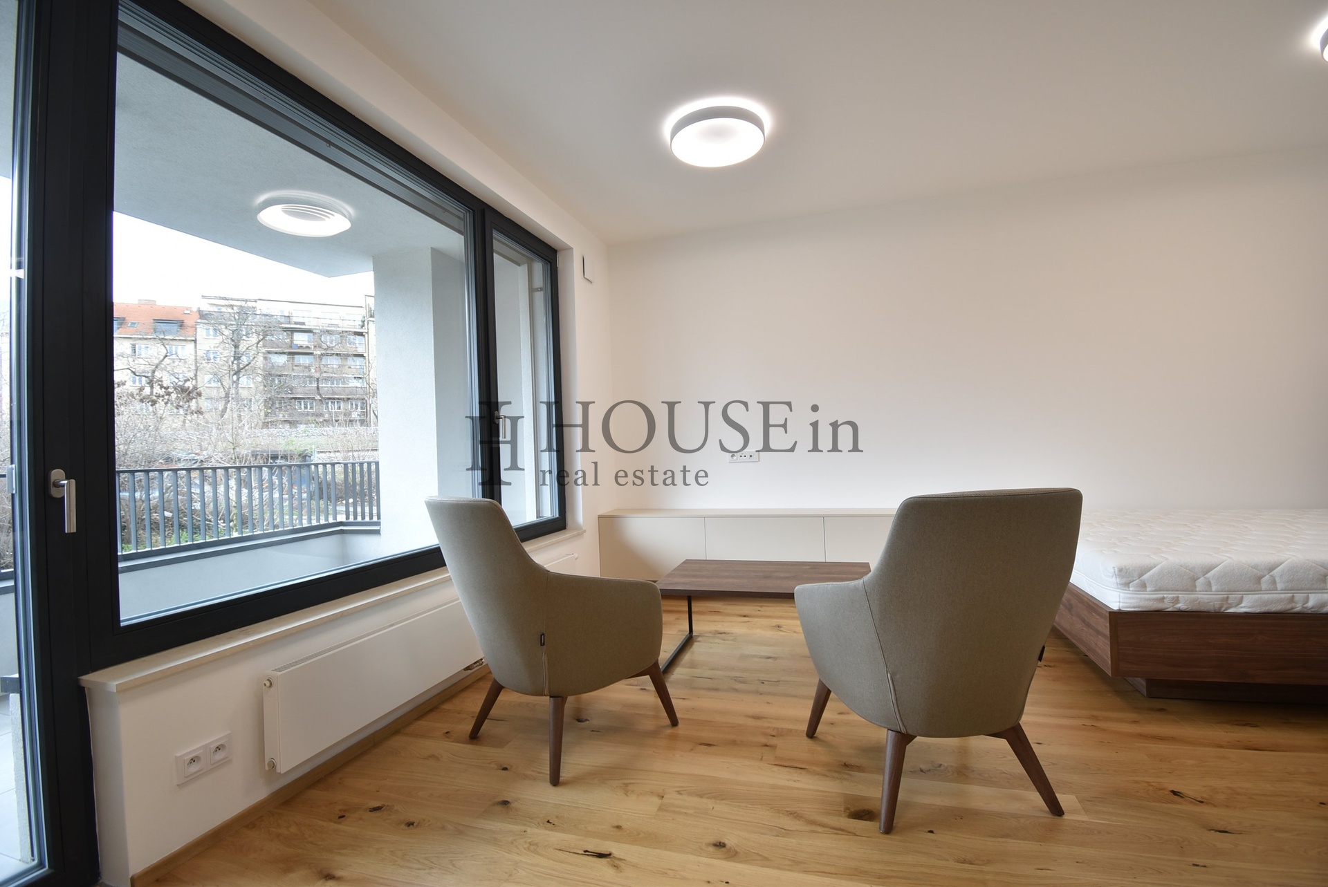Byt nabízí vstupní předsíň, prostorný obývací pokoj s oddělenou kuchyňskou linkou a přímým vstupem na terasu a koupelnu se sprchovým koutem a toaletou. Orientace bytu na západ zajišťuje příjemné odpolední světlo a výhled do klidné ulice.
