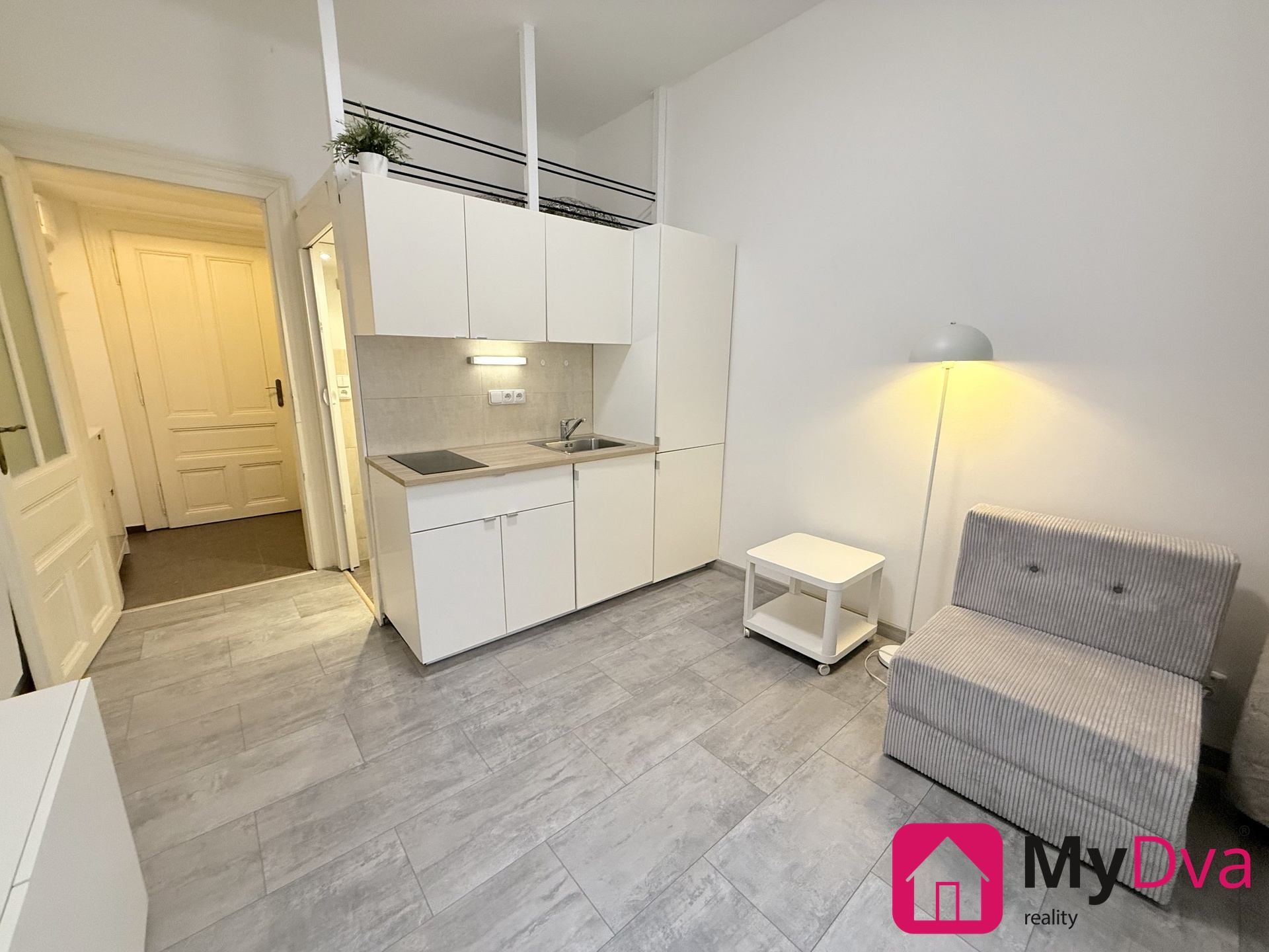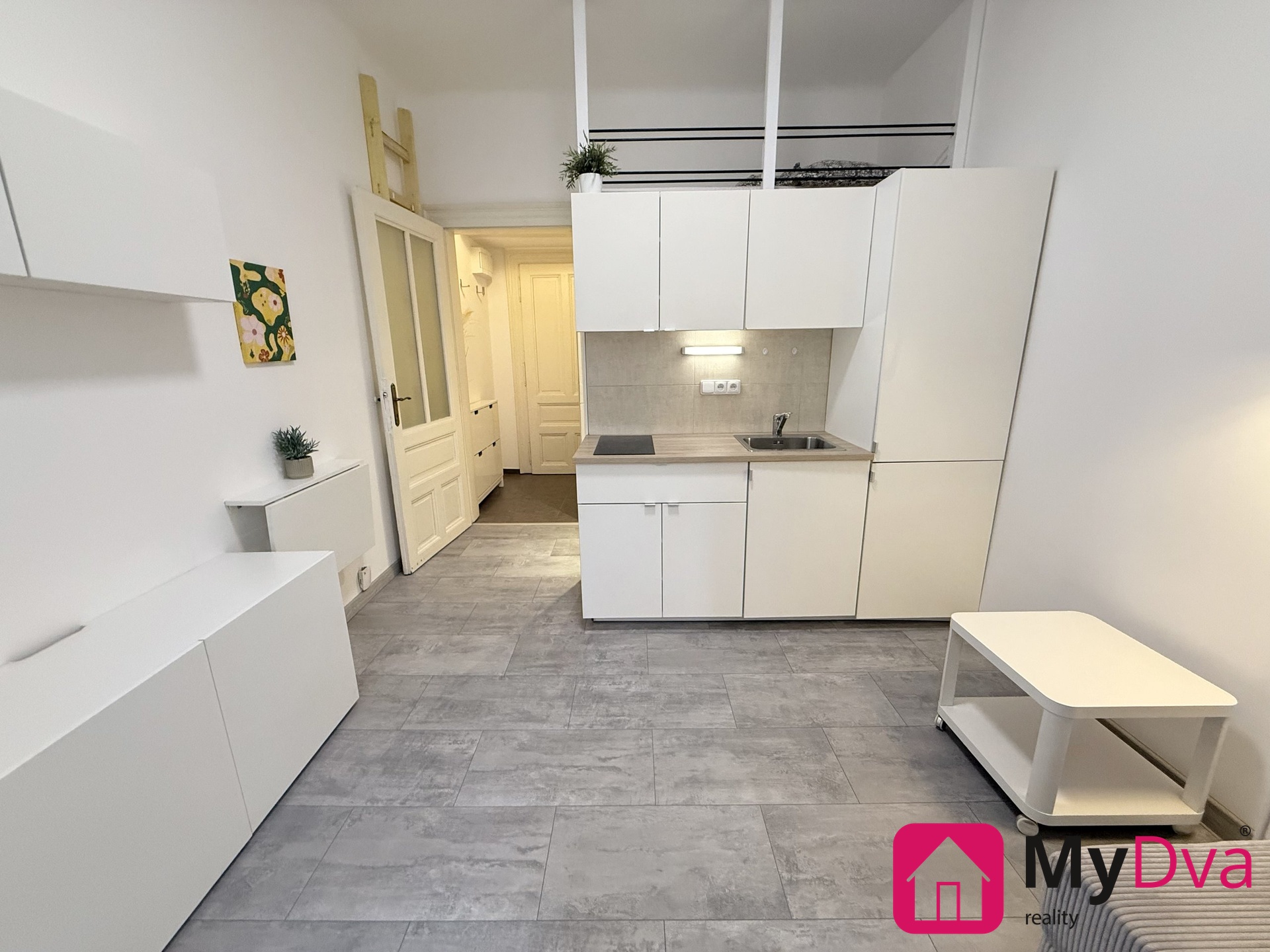 Byt nabízí moderní, čistý prostor připravený k okamžitému nastěhování. Dominantou je obytná část s kuchyňským koutem, který je vybaven kuchyňskou linkou, varnou deskou a dřezem. Díky velkému oknu je místnost příjemně prosvětlená a působí vzdušně.