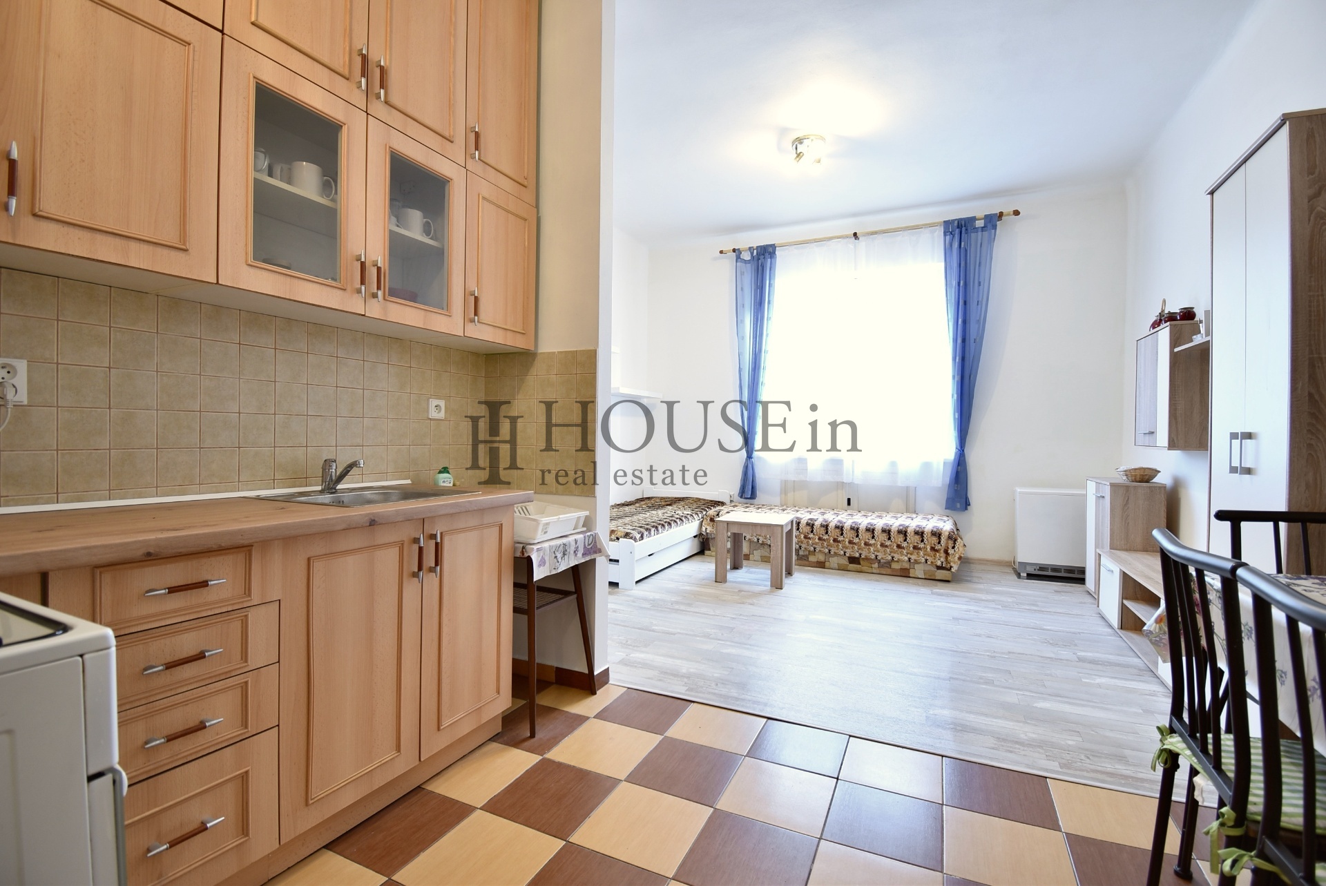 Dispozice: předsíň, samostatná toaleta, obytný pokoj s odděleným kuchyňským koutem a koupelna se sprchovým koutem. Byt je plně vybavený nábytkem a základními spotřebiči, avšak bez pračky.