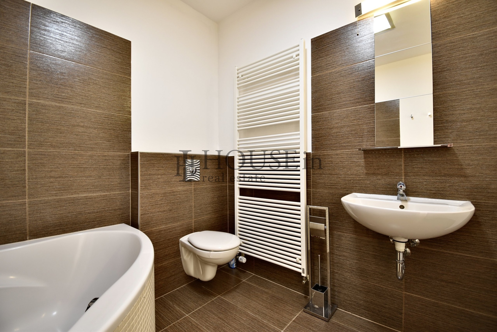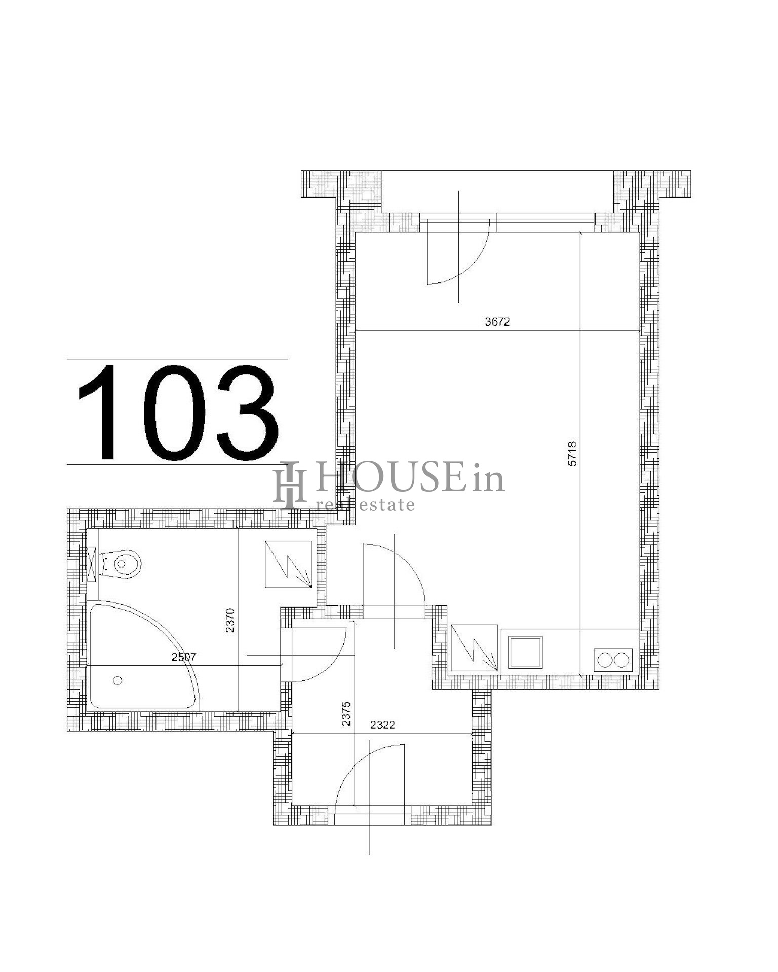 Byt tvoří vstupní předsíň, obytný prostor s kuchyňským koutem a koupelna. Kuchyňský kout je vybaven kuchyňskou linkou, elektrickou varnou deskou a digestoří. Obytný pokoj je prostorný a nabízí dostatek místa pro zařízení dle vlastních představ (byt se pronajímá bez nábytku). Koupelna disponuje rohovou vanou, toaletou, umyvadlem a topným žebříkem. Na podlahách se nachází dřevěná plovoucí podlaha a dlažba v koupelně a předsíni.