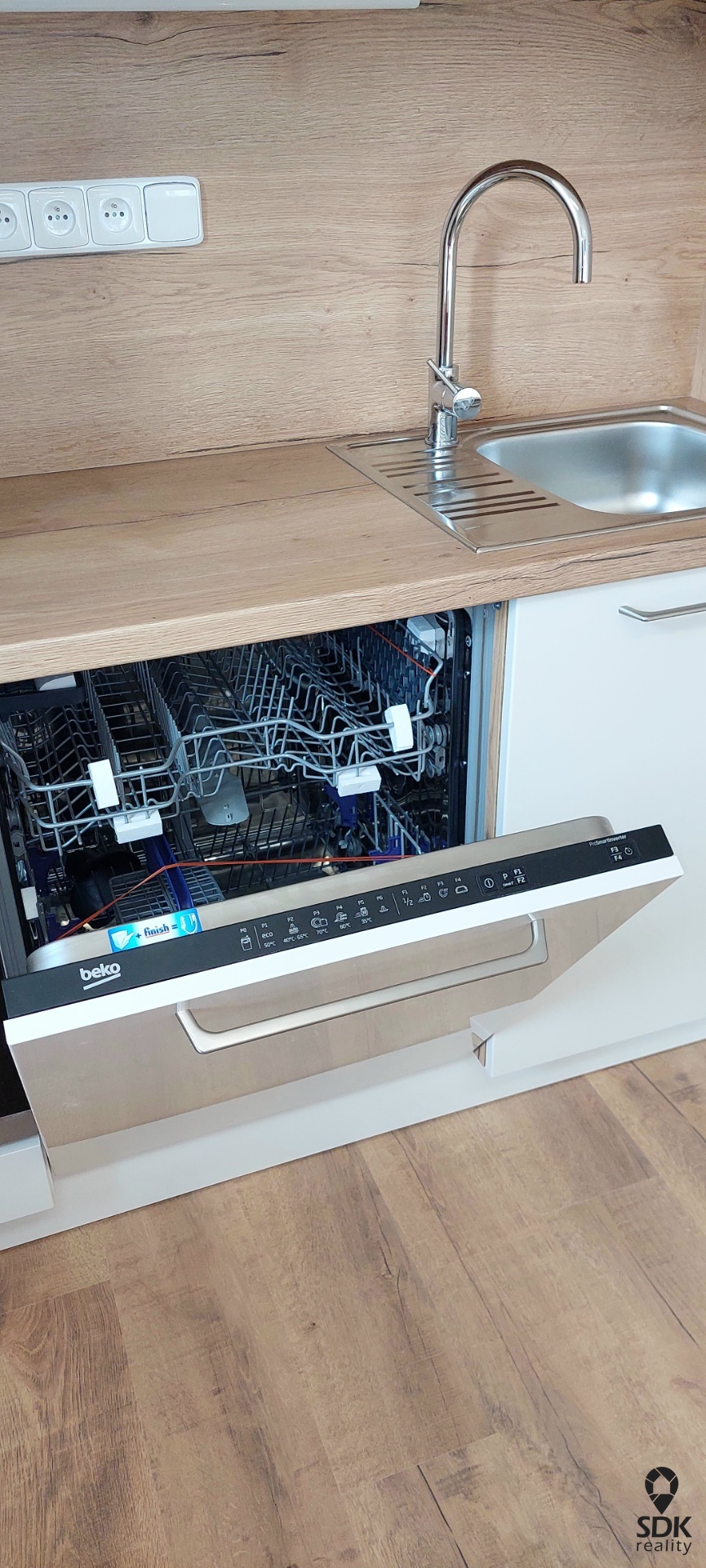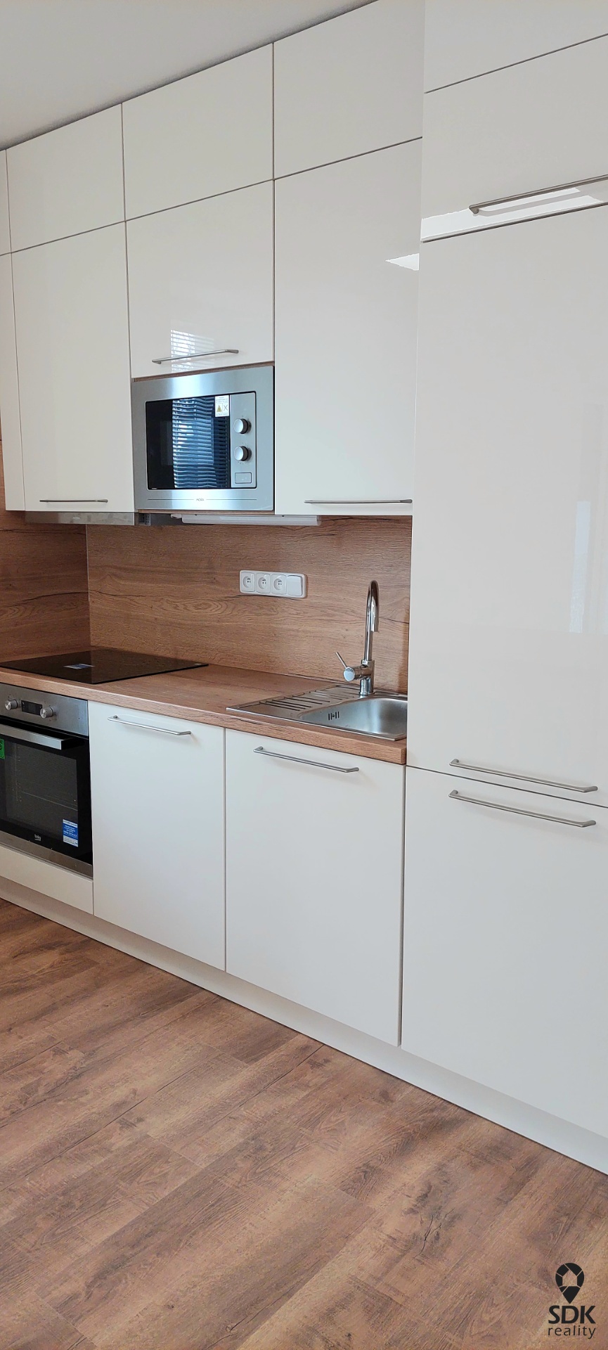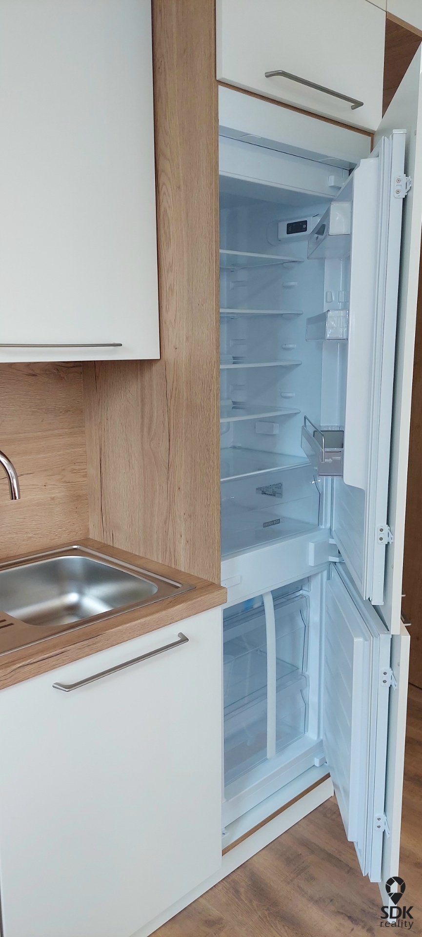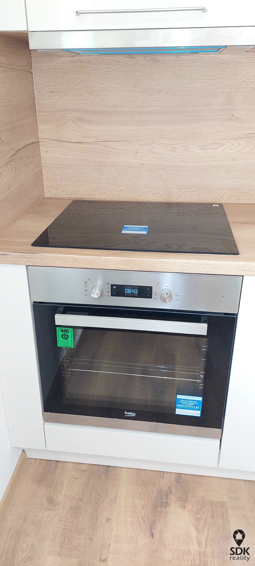 Kuchyňská linka je vybavena veškerými novými vestavnými spotřebiči (horkovzdušná trouba, indukční varná deska, digestoř, mikrovlnná trouba, myčka, lednice s mrazničkou).
