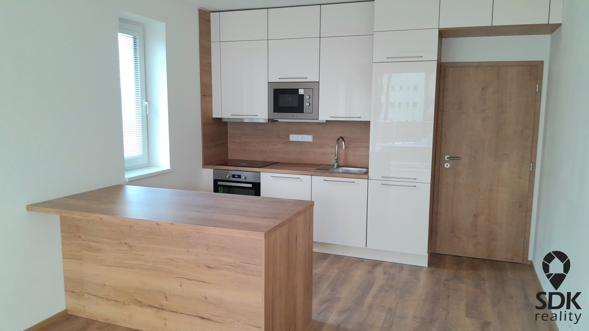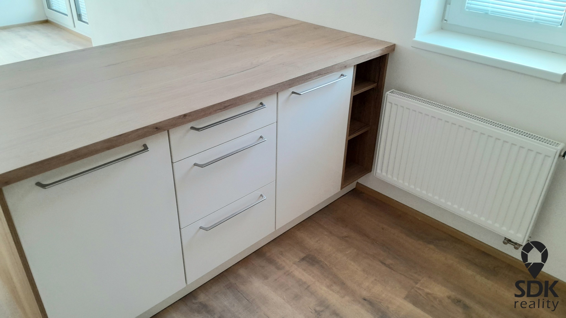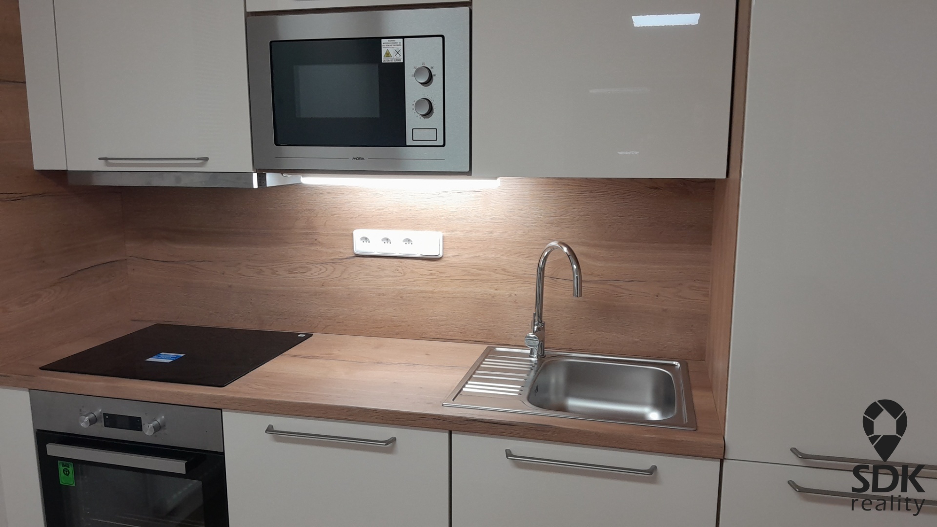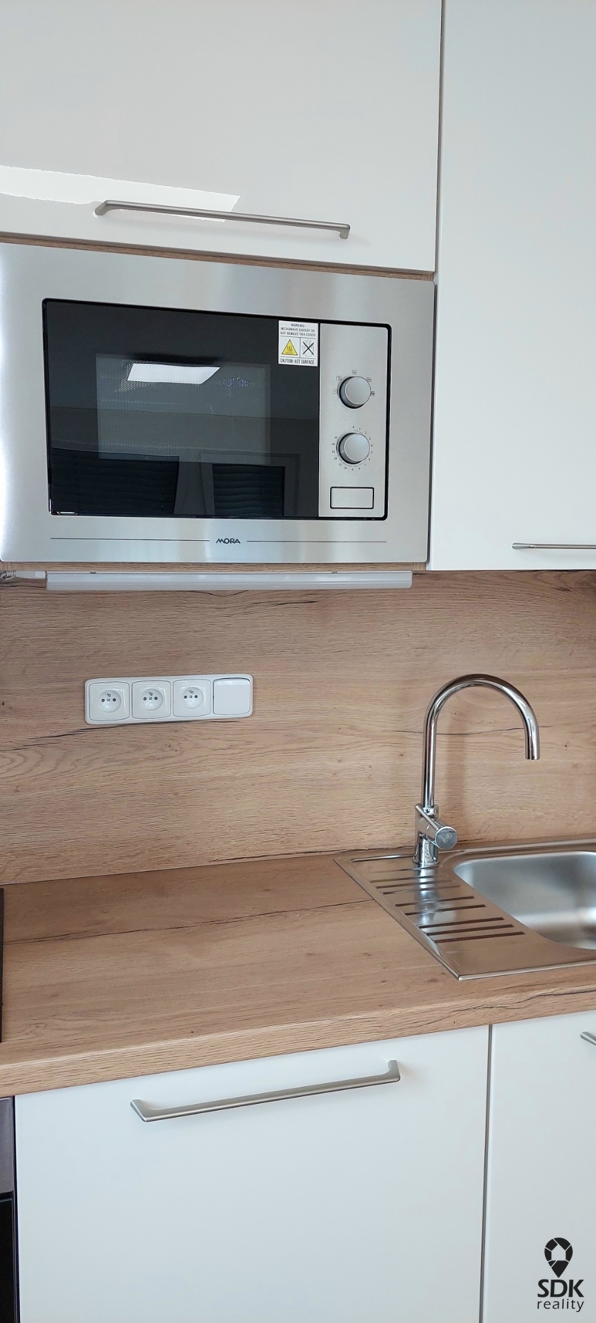 Kuchyňská linka je vybavena veškerými novými vestavnými spotřebiči (horkovzdušná trouba, indukční varná deska, digestoř, mikrovlnná trouba, myčka, lednice s mrazničkou).