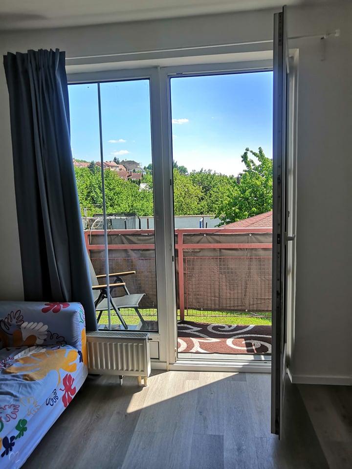 Byt se nachází v 1. nadzemním patře, disponuje vlastním balkónem orientovaným směrem na jih, dále také sklepní kojí a velkou oplocenou zahradou za domem, která náleží pouze danému domu k relaxaci s orientací také na jih.