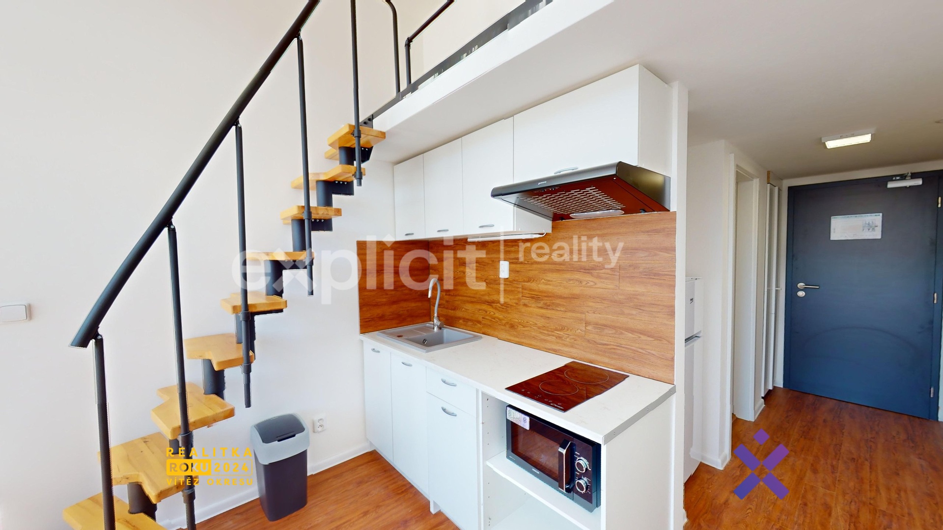 Hned po vstupu do ateliéru naleznete zádveří, ze kterého vstupujete do obývacího pokoje, jehož součástí je kuchyňský kout.