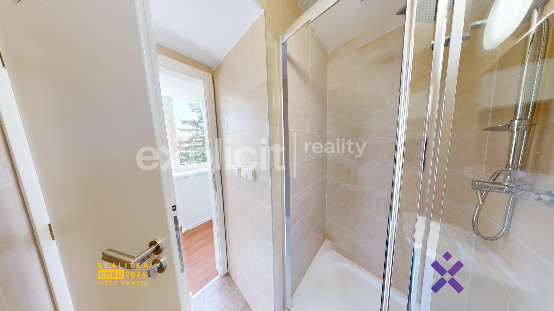 Moderní a čistá koupelna se sprchovým koutem je společně s toaletou sloučena dohromady.