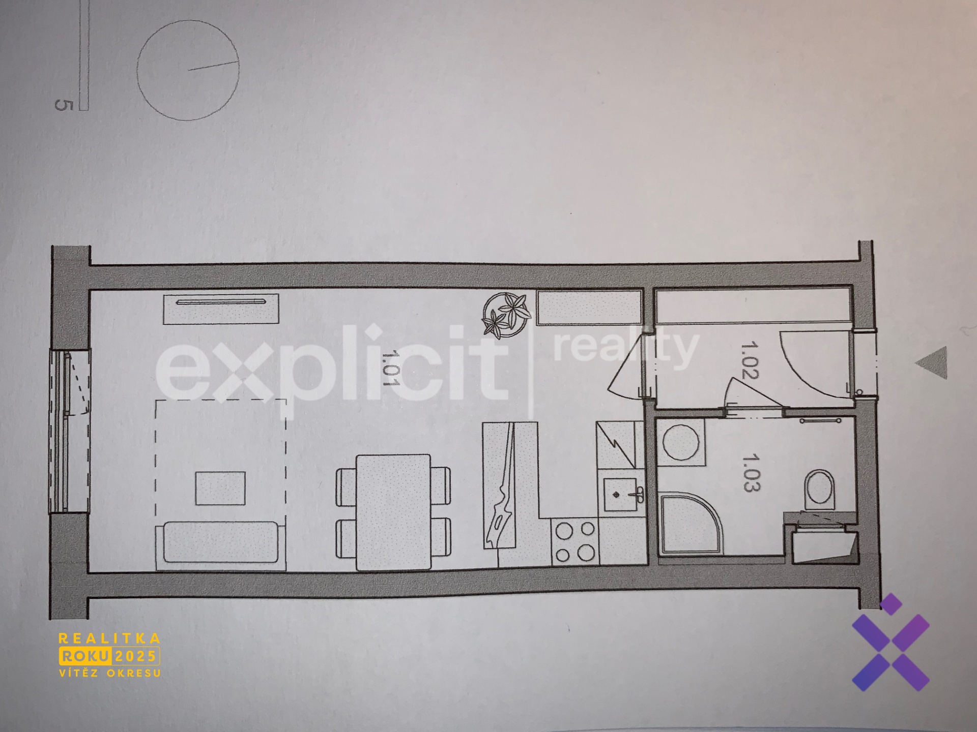 Obývací část o velikosti 24 m² s kuchyňským koutem, který je vybaven kuchyňskou linkou se sporákem a přípravou k instalaci myčky na nádobí.