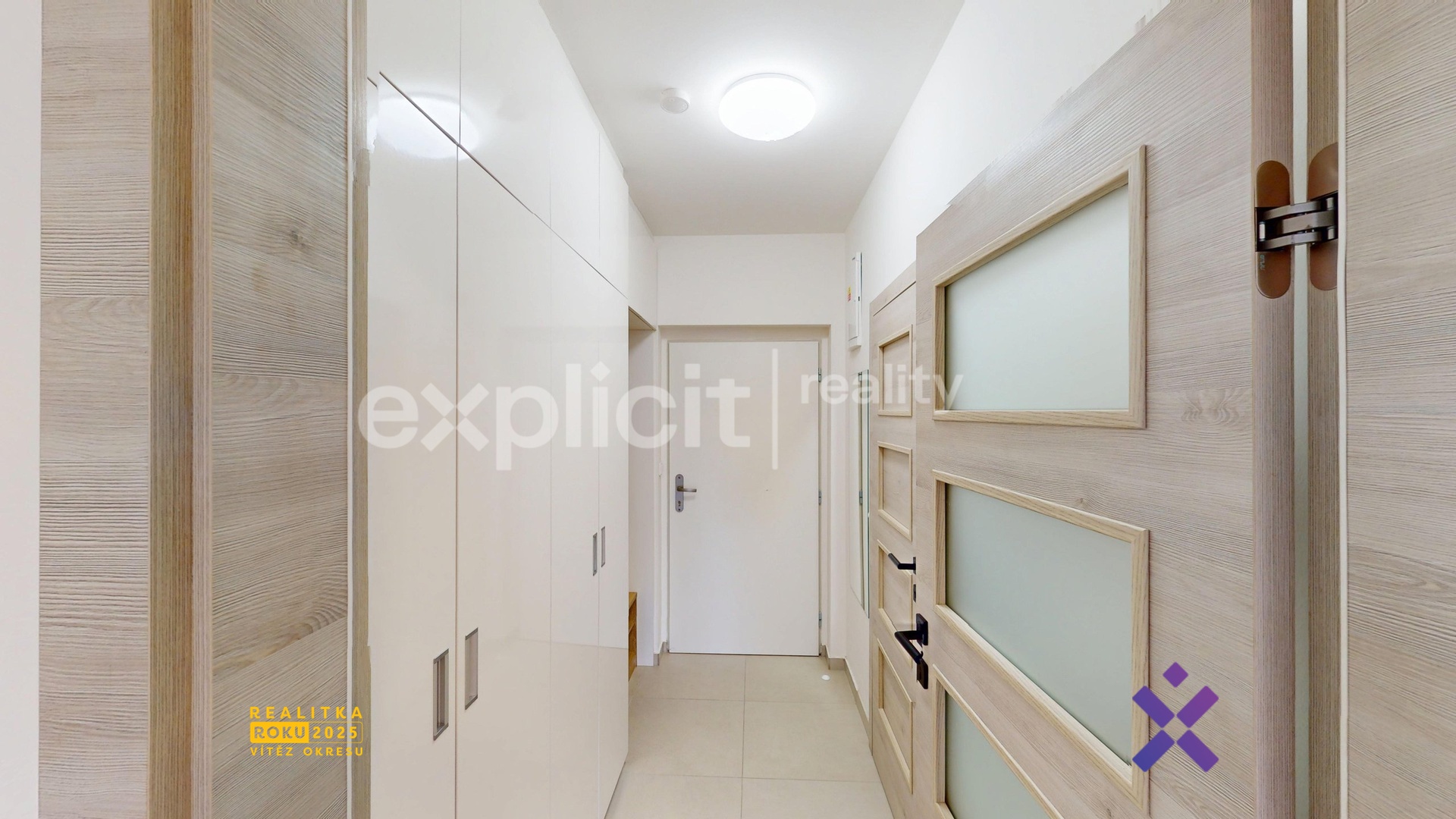 Po vstupu do bytu se nachází chodba s velkou vestavěnou skříní a věšákovou stěnou, která poskytuje praktické zázemí a dostatek úložného prostoru. Po levé straně je koupelna vybavená toaletou, sprchovým koutem, topným žebříkem a pračkou.