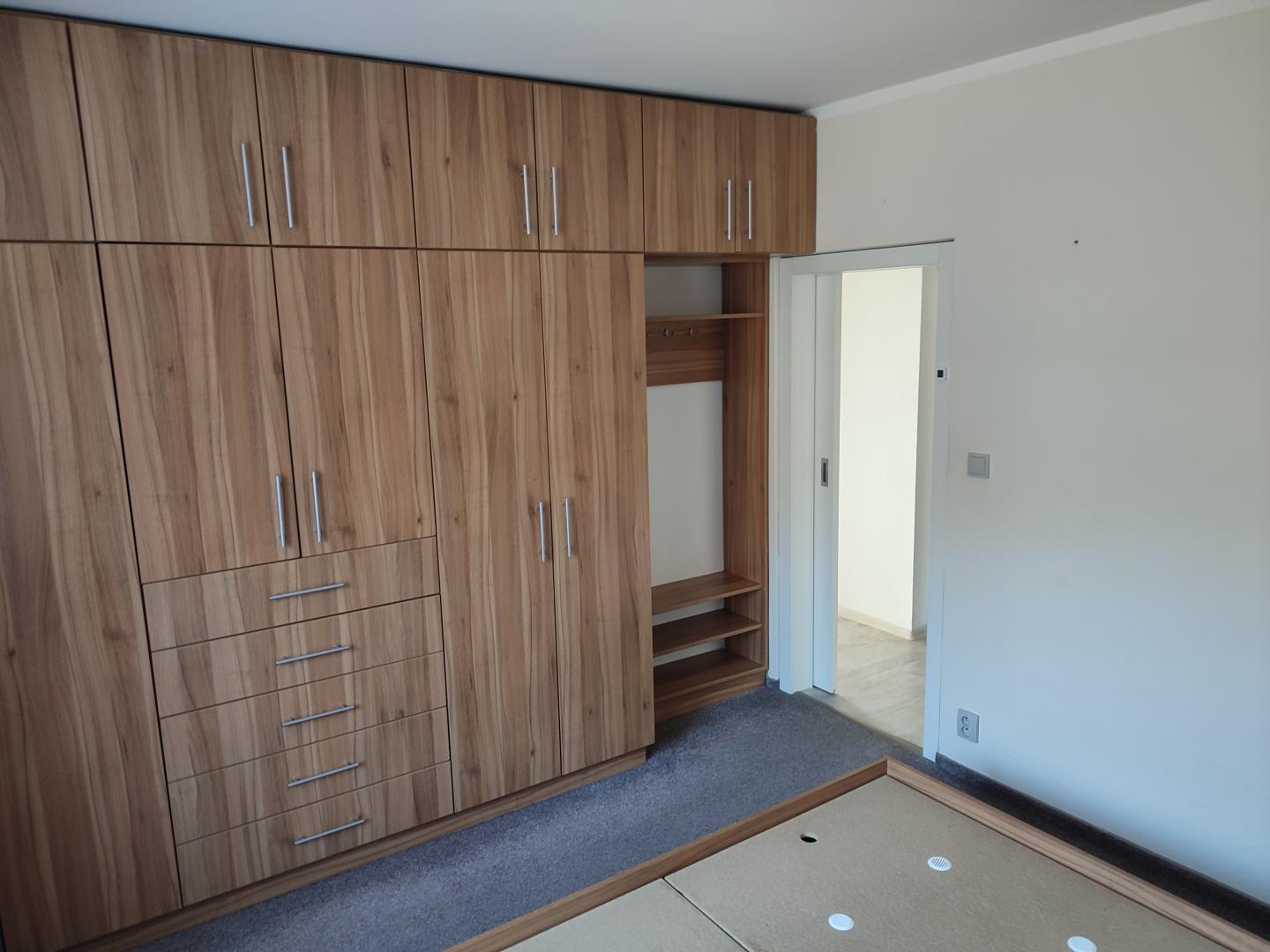 Velkou výhodou je šatna 5,1 m2 s mnoha úložnými policemi a skříněmi. Pokoje jsou neprůchozí s chodbou o výměře 6 m2, která celou dispozici propojuje.