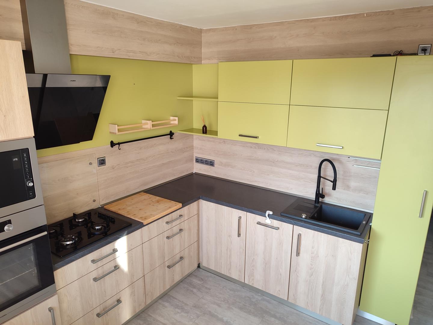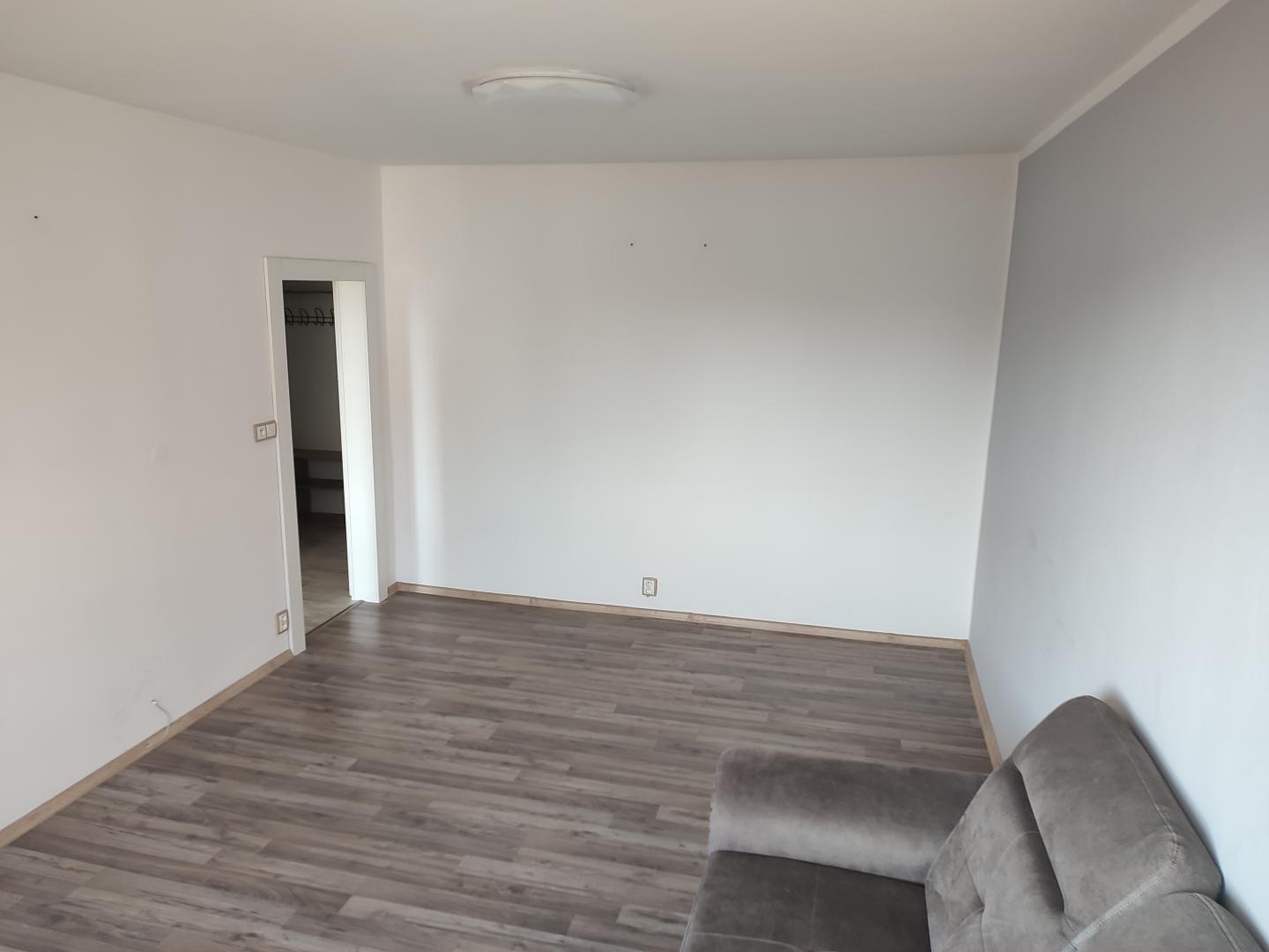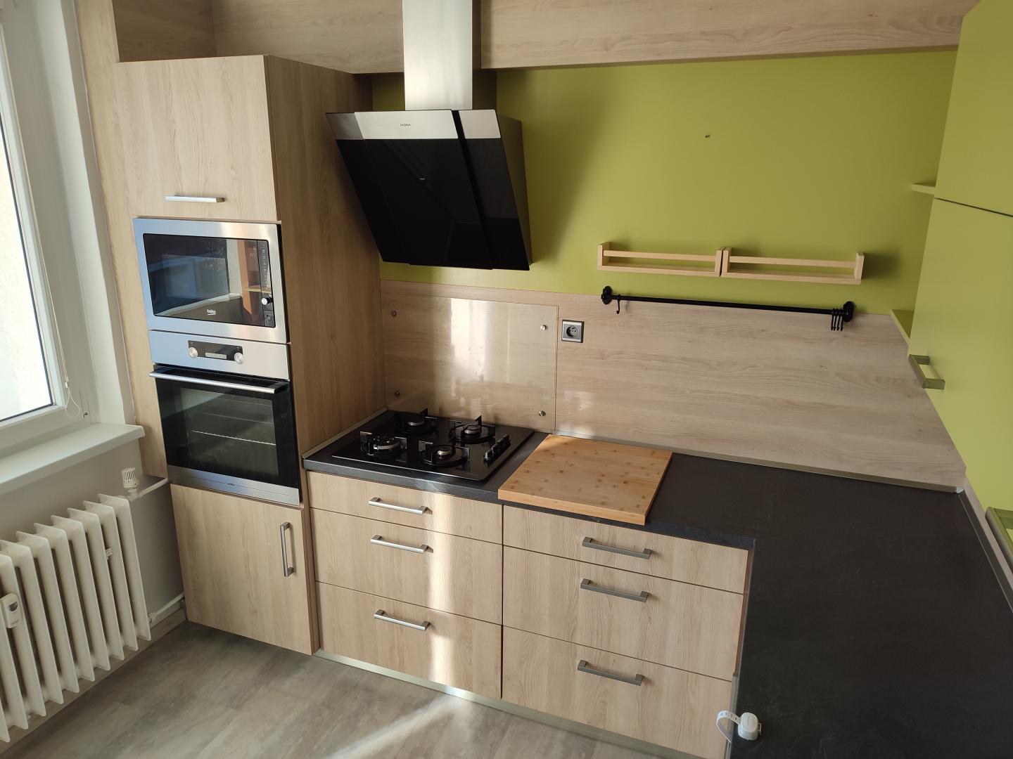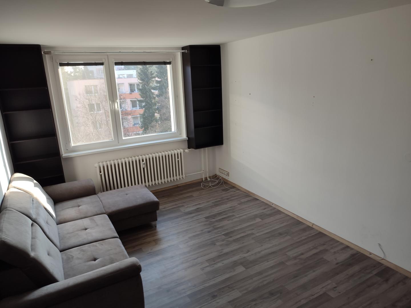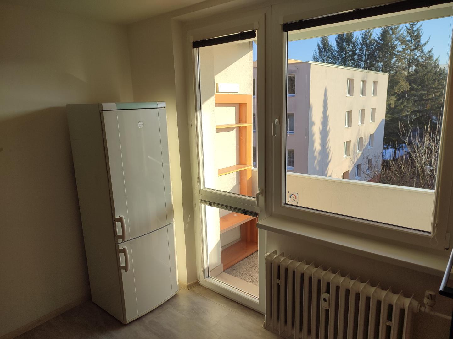 Byt je vybaven částečně nábytkem, kombinovanou lednicí a kompletními kuchyňskými spotřebiči.