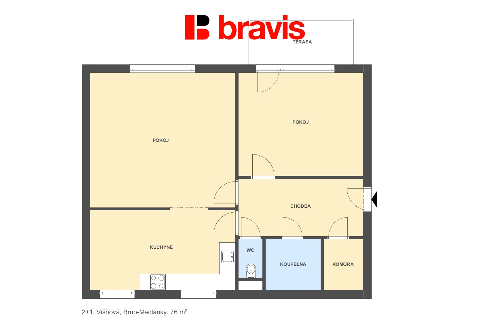 Byt o výměře 76 m2 se nachází ve 2. nadzemním podlaží cihlového bytu bez výtahu. K bytu náleží terasa s výhledem do zeleně.