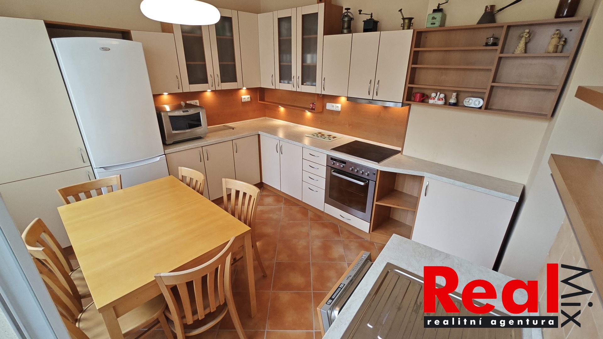 Byt je zařízen kuchyňskou linkou s el. multifunkční troubou a sklokeramickou varnou deskou, myčkou, ledničku s mrazákem a mikrovlnnou troubou, dále je v bytě pračka a sušička, ložnice je vybavená velmi prostornou šatní skříní a vyklápěcím vestavěným dvoulůžkem, v obývacím pokoji je k dispozici nábytek dle fotodokumentace, v předsíni je vestavěná prostorná skříň a dále jsou k dispozici úložné prostory v předsíňové části pod stropem.