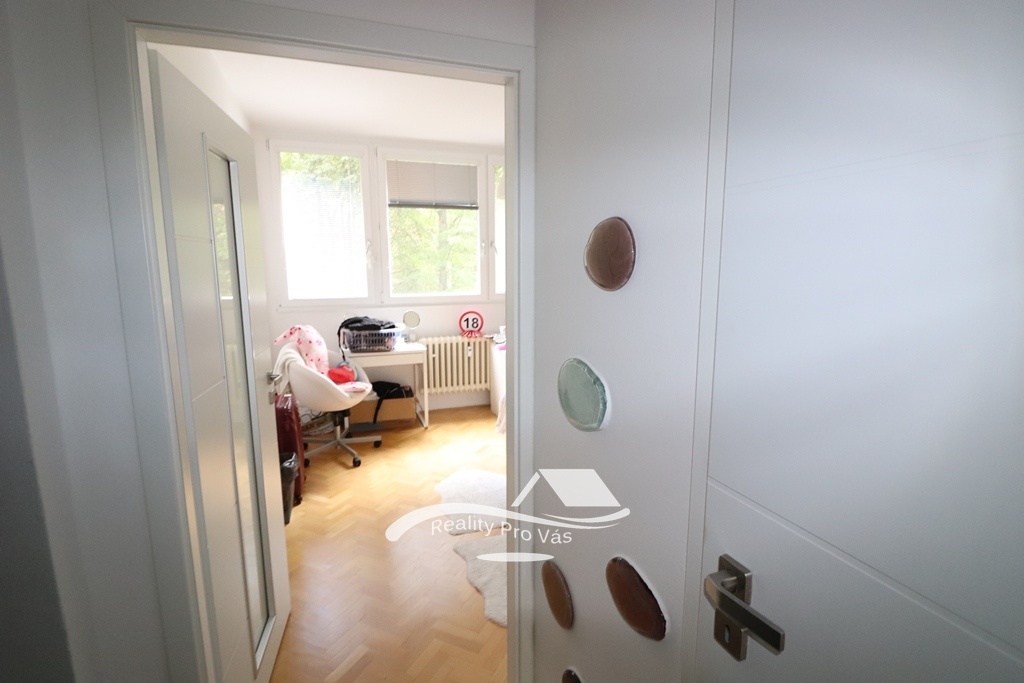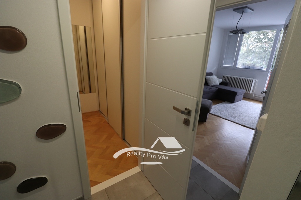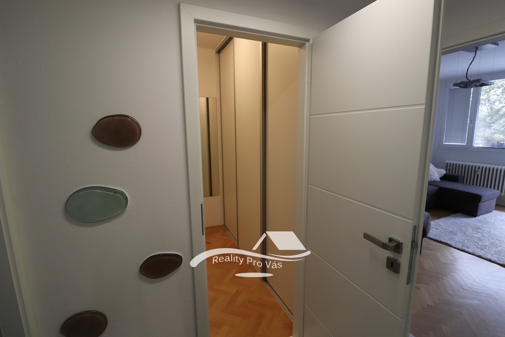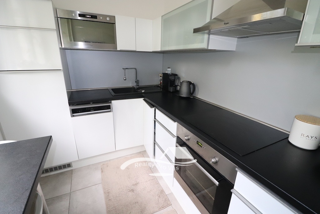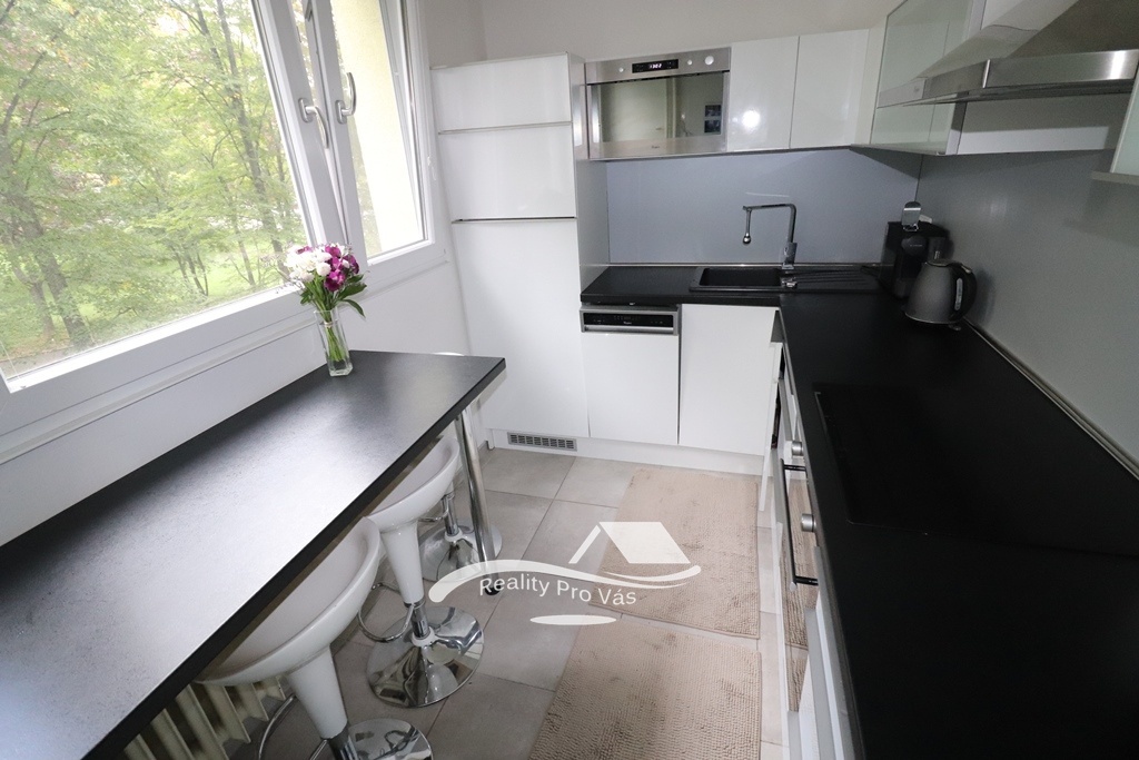 Byt prošel celkovou rekonstrukcí – nová kuchyňská linka včetně spotřebičů (myčka, sporák, mikrovlnka, digestoř), nová koupelna se sprchovým koutem WC je zvlášť, v bytě jsou nové podlahy (dlažba, parkety), vnitřní dveře, na chodbě a v komoře jsou nové vestavěné skříně.