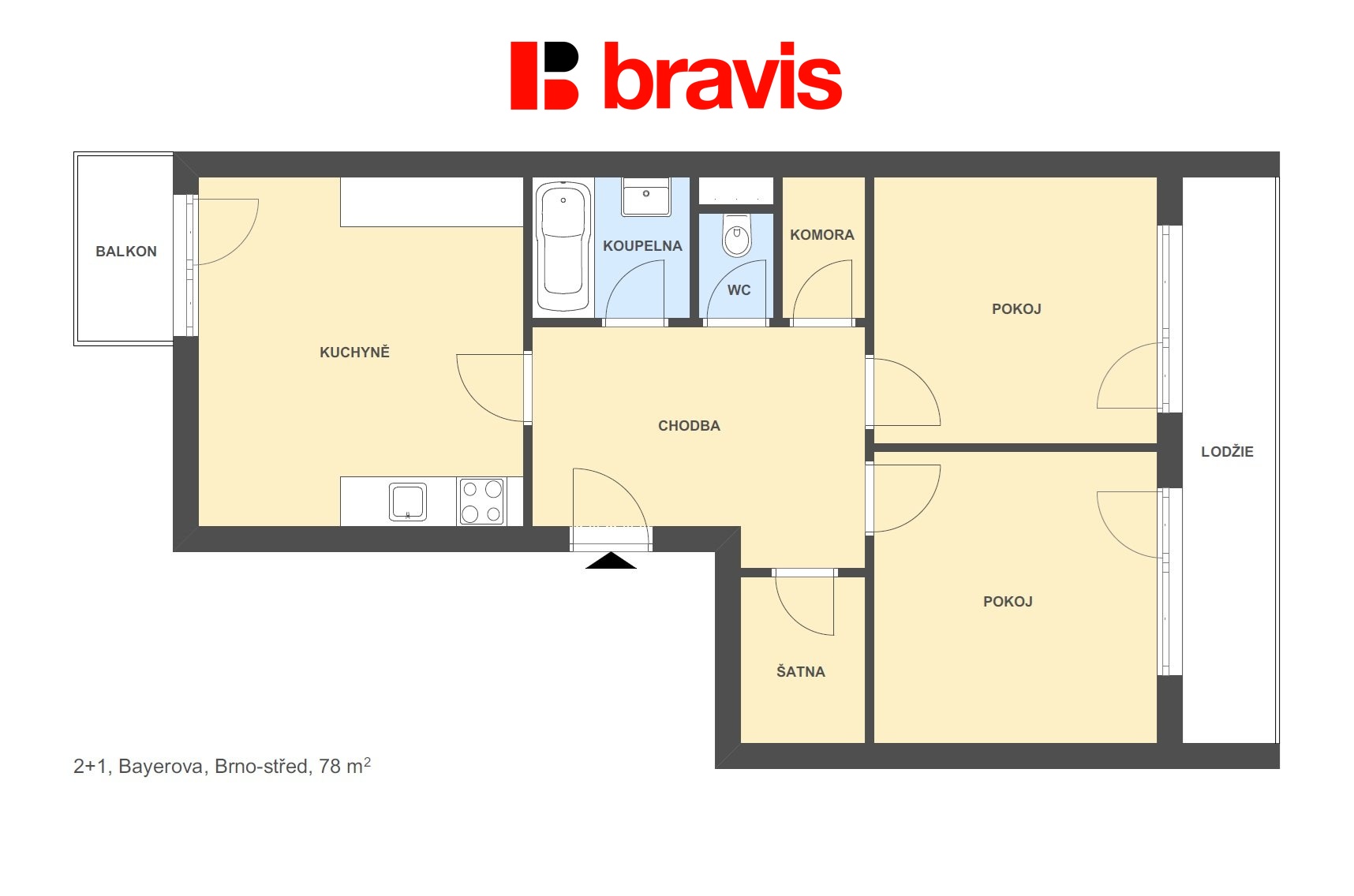 Ve výhradním zastoupení majitele nabízíme k pronájmu nezařízený byt 2+1 o užitné ploše 78 m2 s prostornou lodžií 10 m2, balkonem a šatnou v mimořádně atraktivní lokalitě brněnské městské části Veveří na ulici Bayerova.