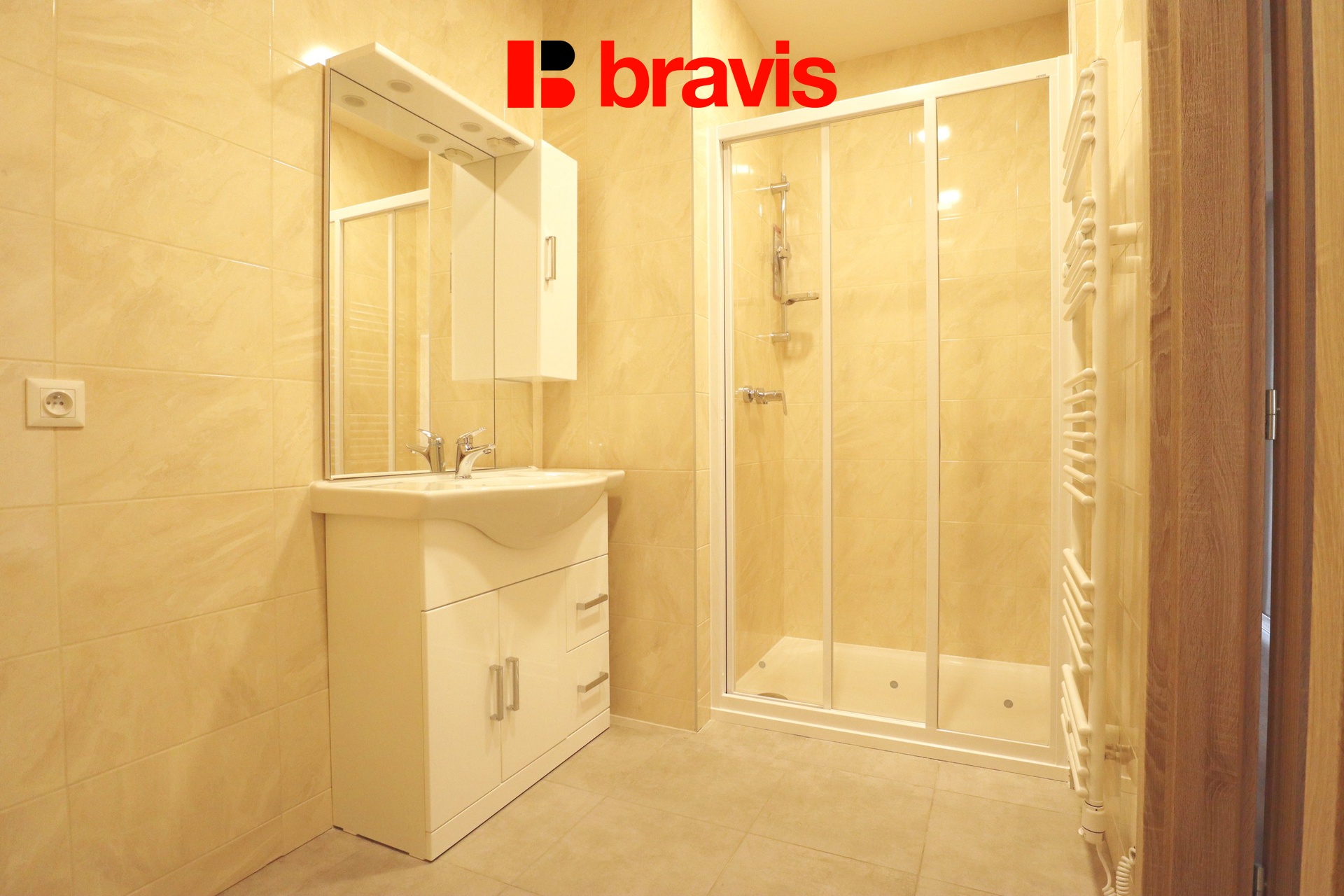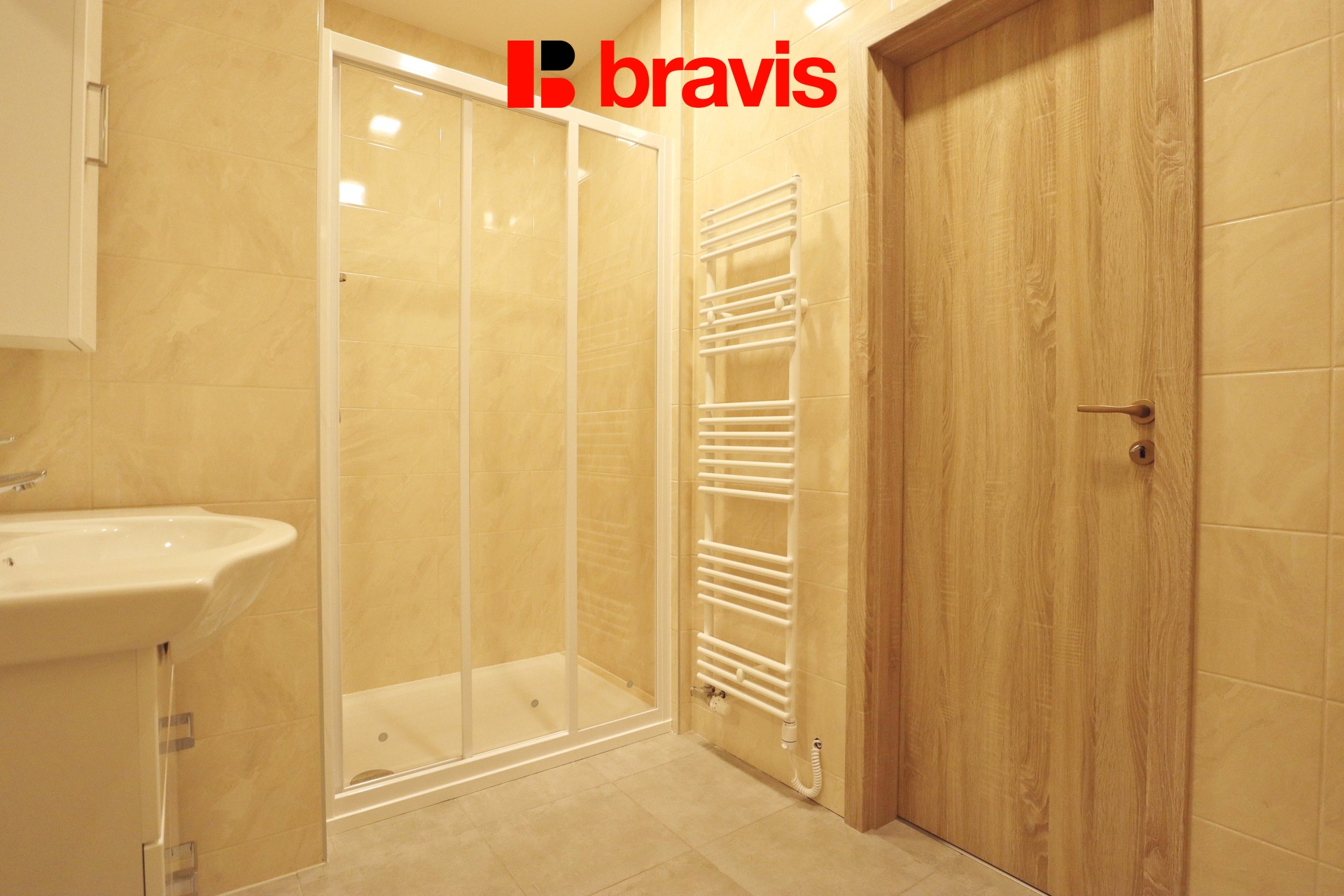 Koupelna je vybavena sprchovým koutem, umyvadlovou skříňkou se zrcadlem, pračkou a otopným žebříkem.