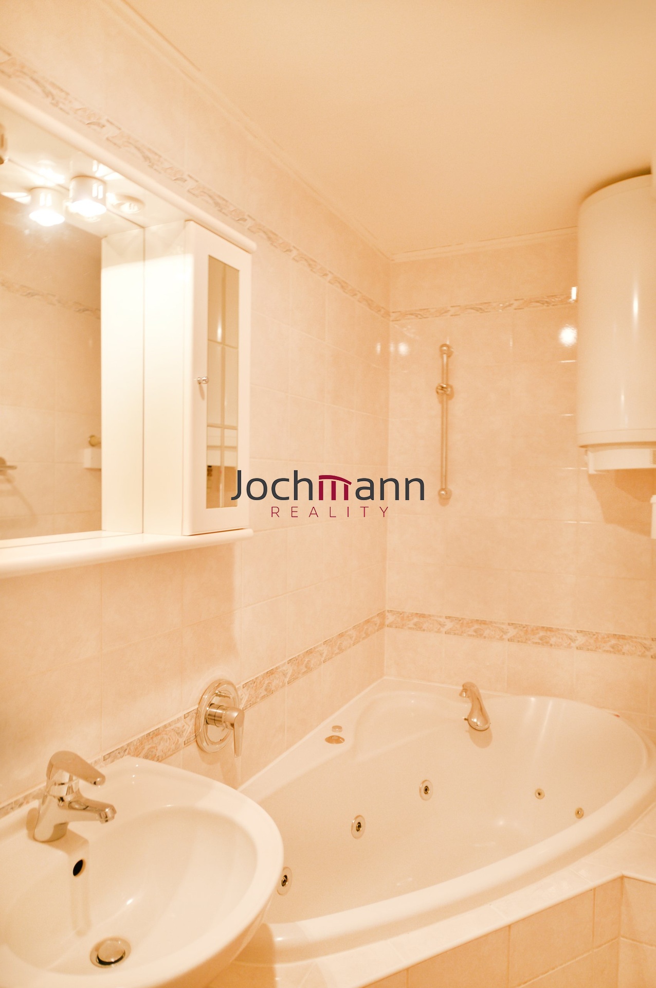 Byt disponuje vstupní chodbou se samostatnou toaletou, na kterou plynule navazuje kuchyně s plně vybavenou kuchyňskou linkou (varná deska, trouba, myčka, lednička, mrazák), samostatnou komorou (spižírna) a koupelnou s rohovou vanou, umyvadlem s úložným prostorem a elektrickým bojlerem.
