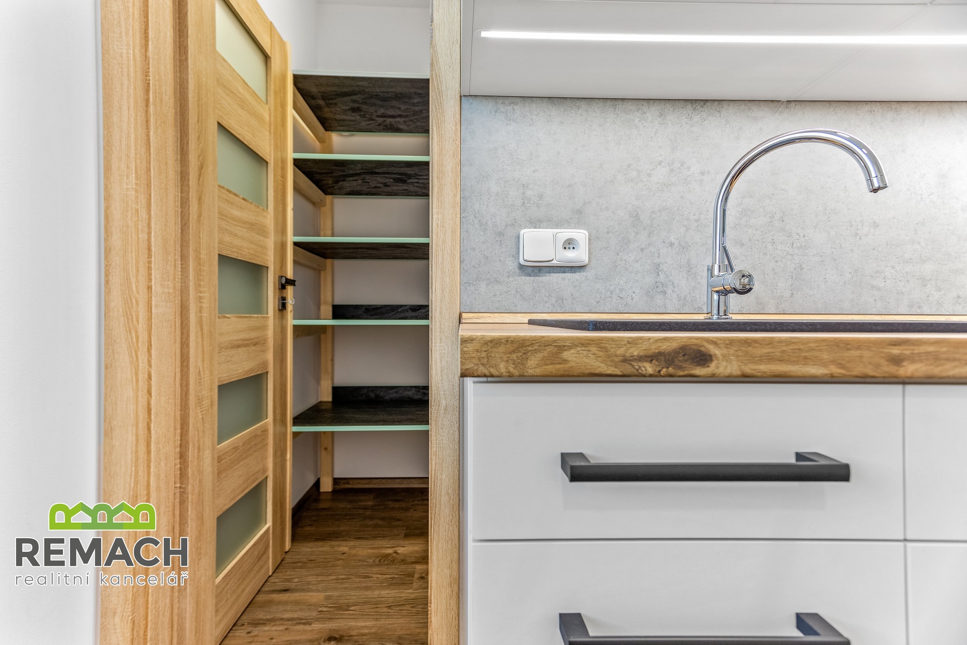 Kuchyňský kout, který je vybaven spotřebiči (myčka, lednice,el.trouba, el.deska) za kuchyní se nachází komora s regálovým systémem.