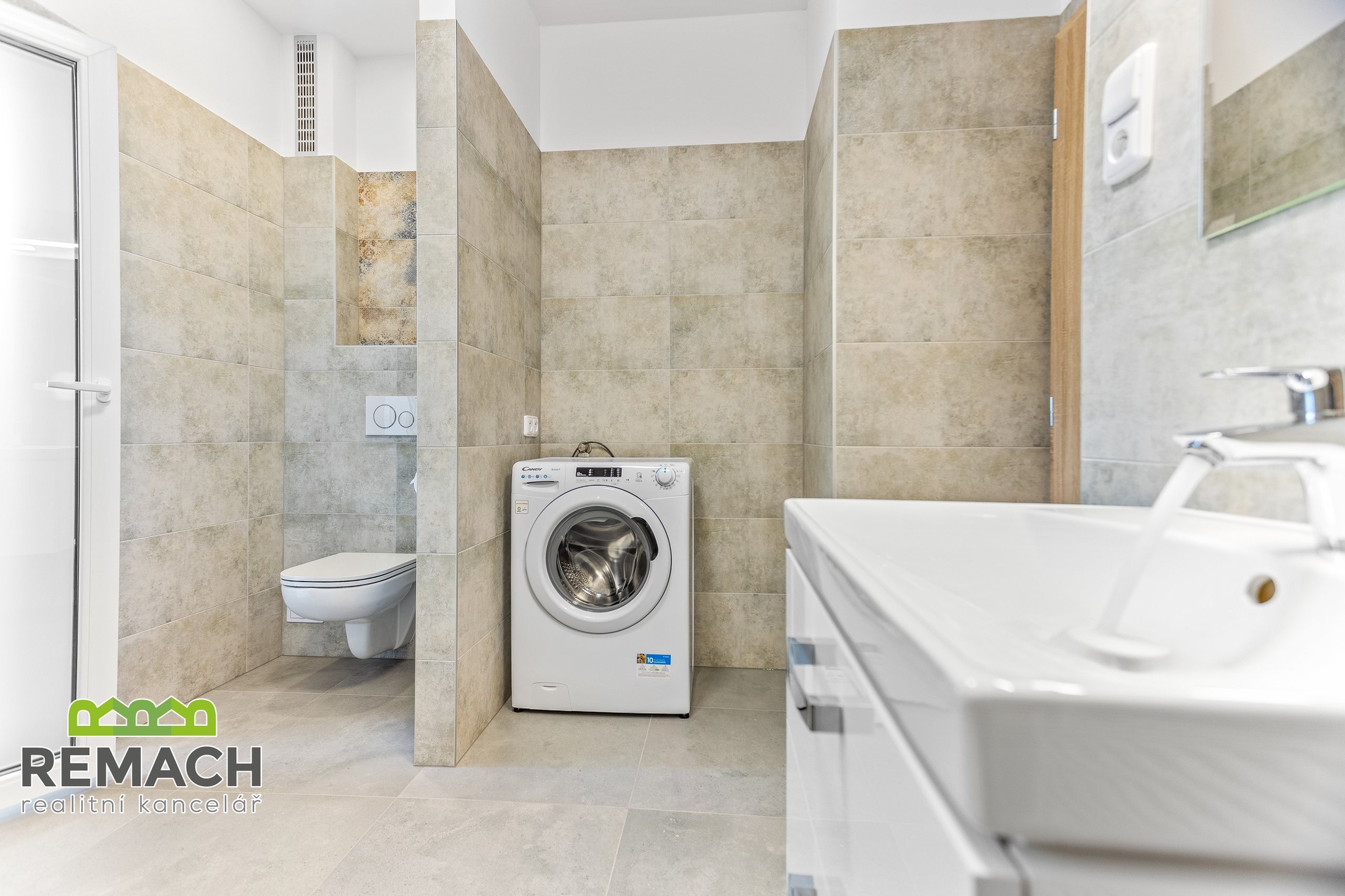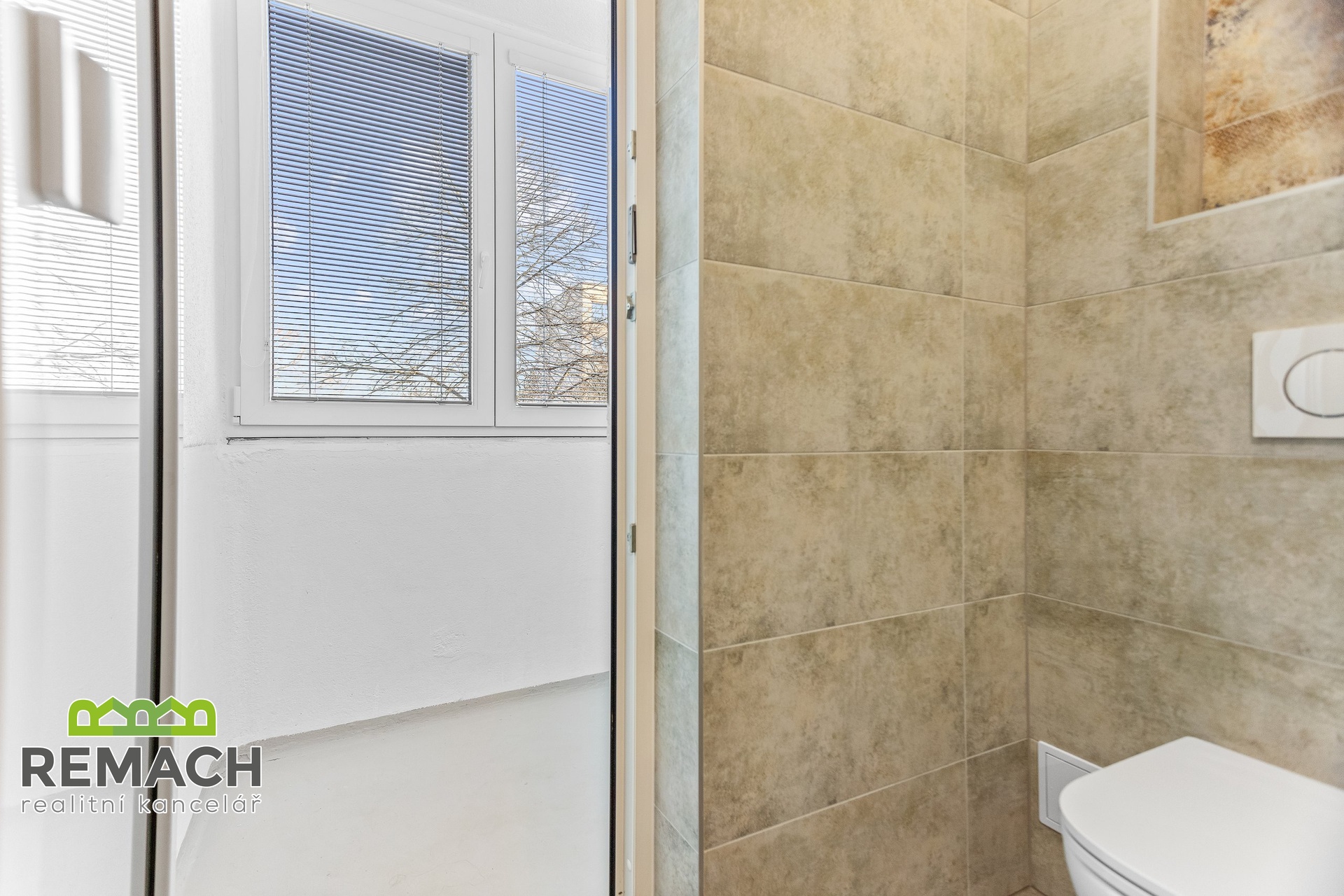 Koupelnu se sprchovým koutem a sanitárním vybavením. ( novou pračkou) a s výstupem do lodžie s okny.