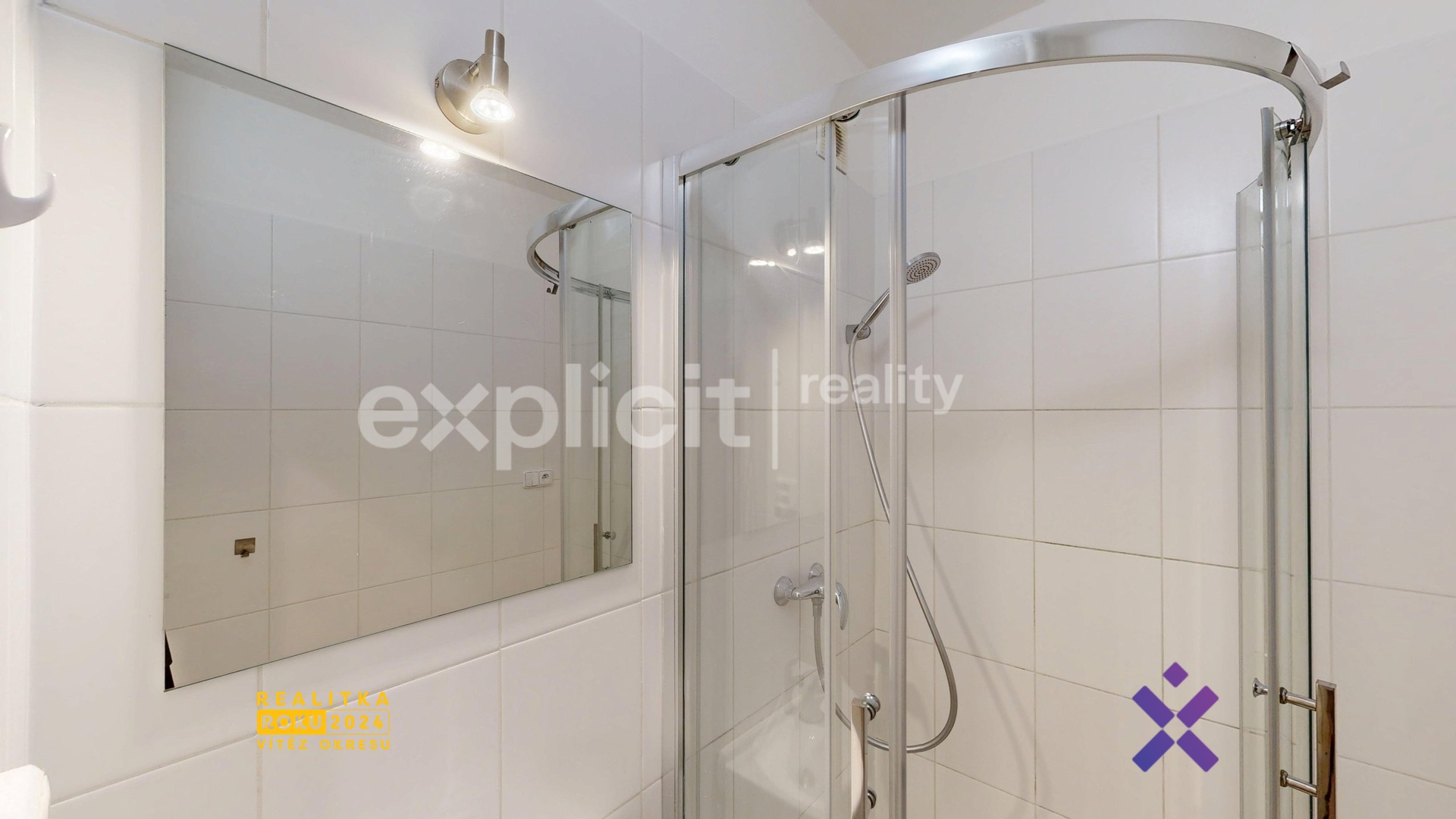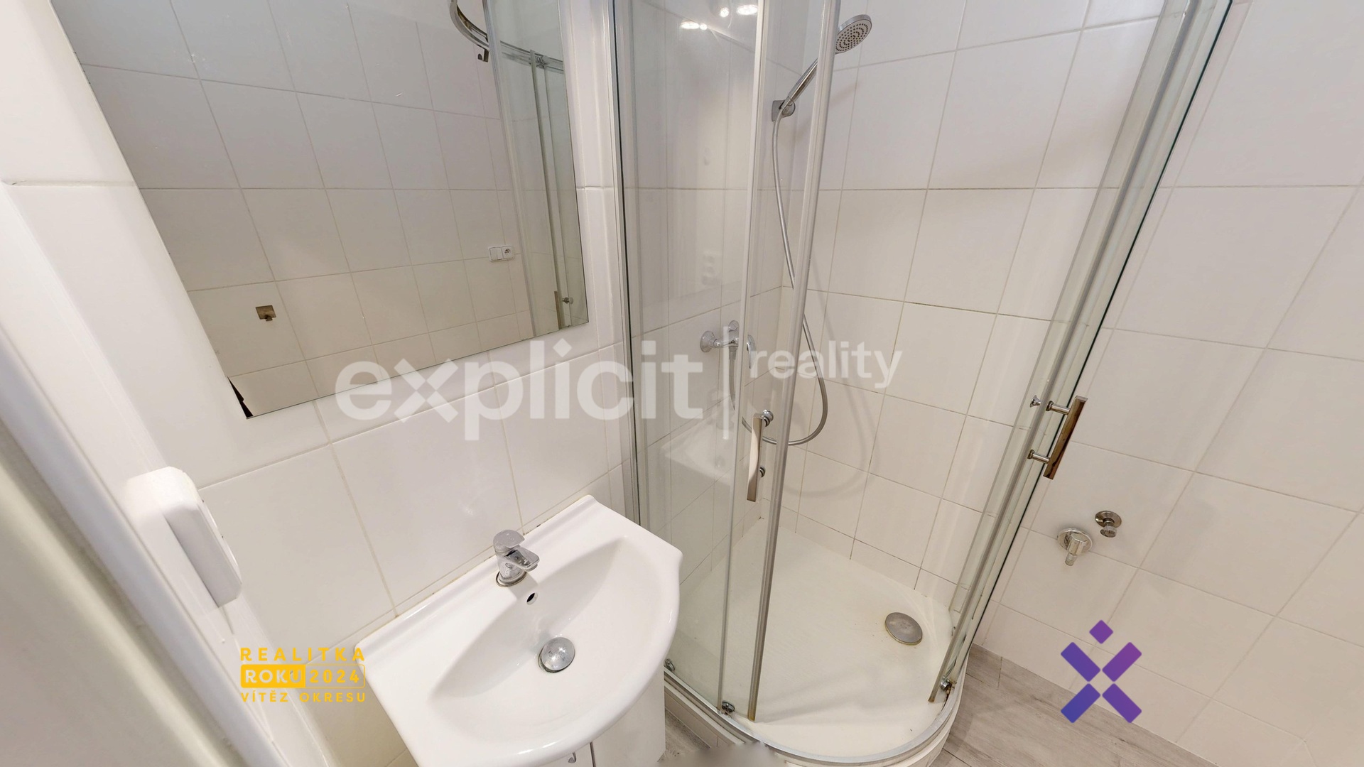 U vstupu se nachází koupelna se sprchovým koutem a přípojkou na pračku.