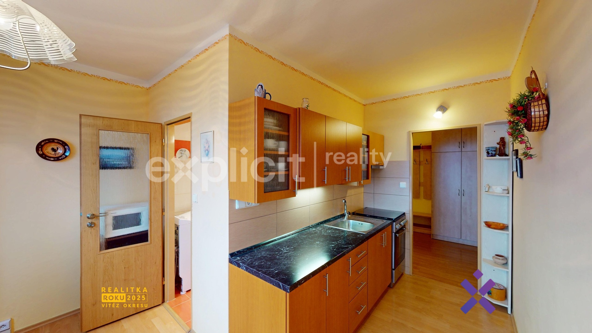Poslední místností je kuchyně, vybavená kuchyňskou linkou s troubou a digestoří, volně stojící lednicí, mikrovlnou troubou, jídelním stolem se židlemi a praktickou špajzkou. K této místnosti přímo navazuje koupelna s vanou a pračkou. Samostatná toaleta je přístupná přímo z chodby.