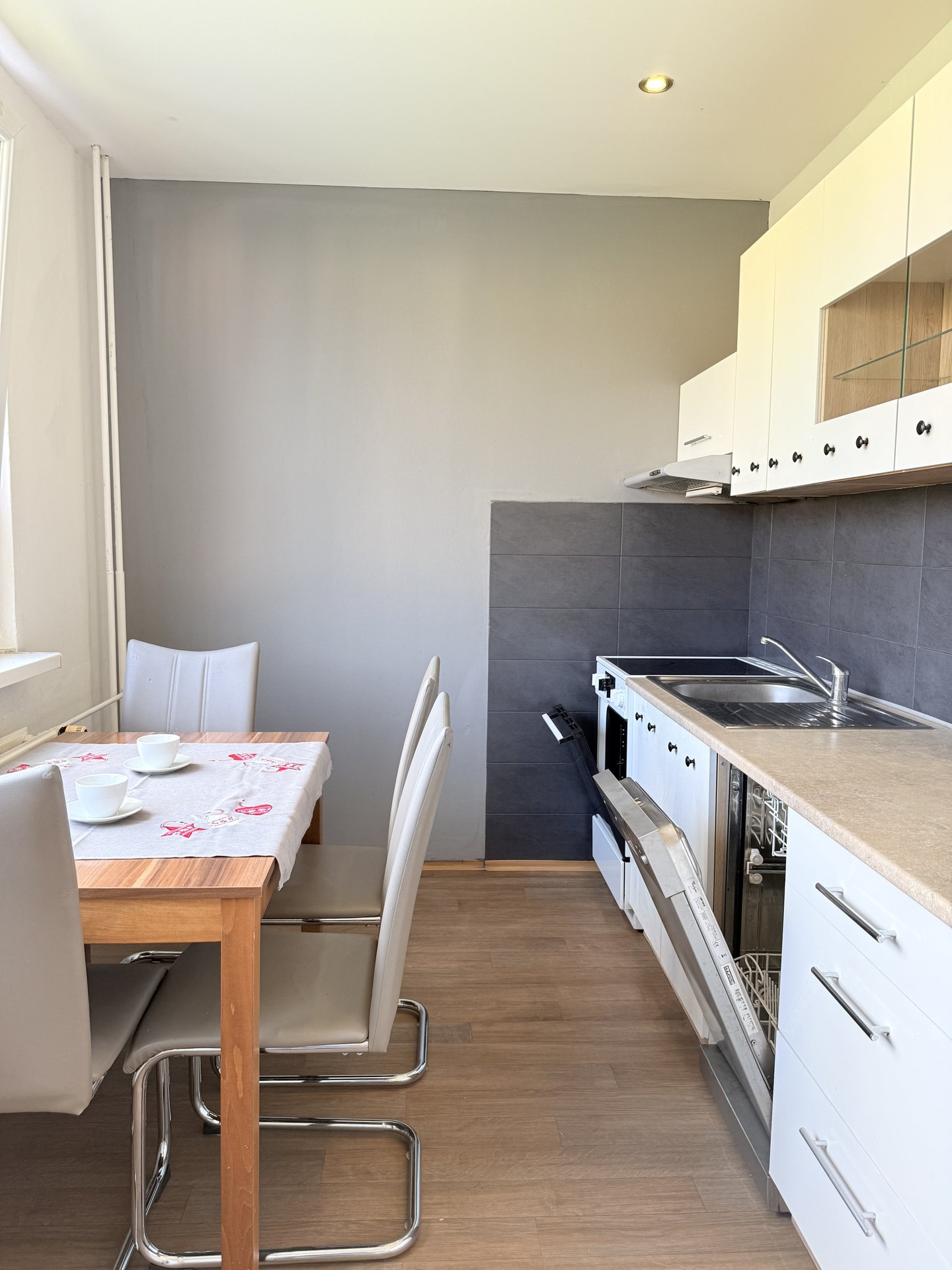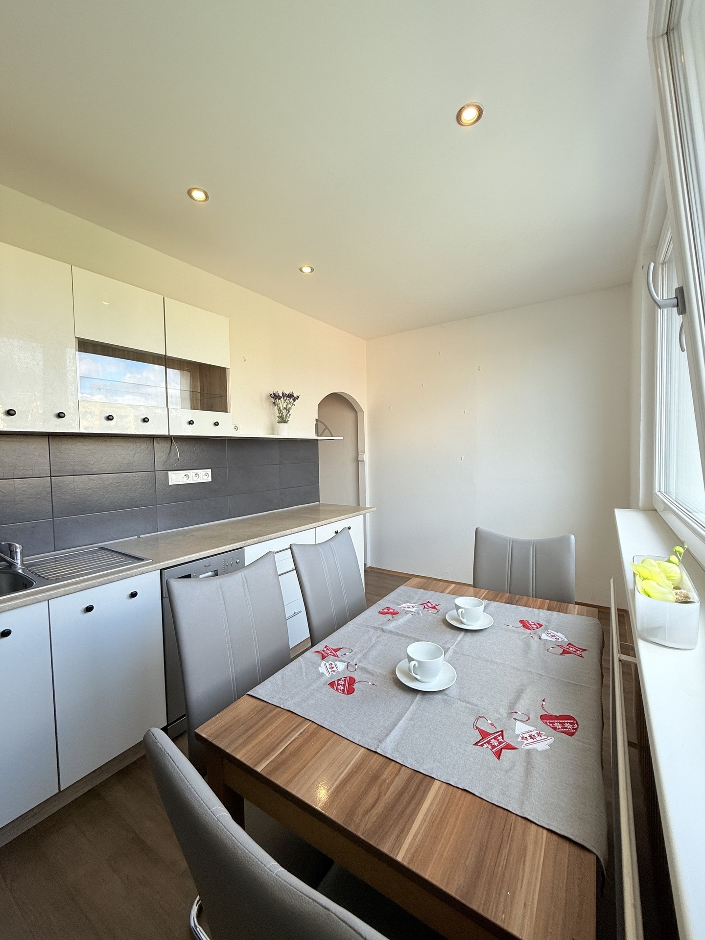 V kuchyni je kuchyňská linka s myčkou, elektrický sporák, stůl a židle. Z kuchyně je krásný výhled na Jizerské hory.