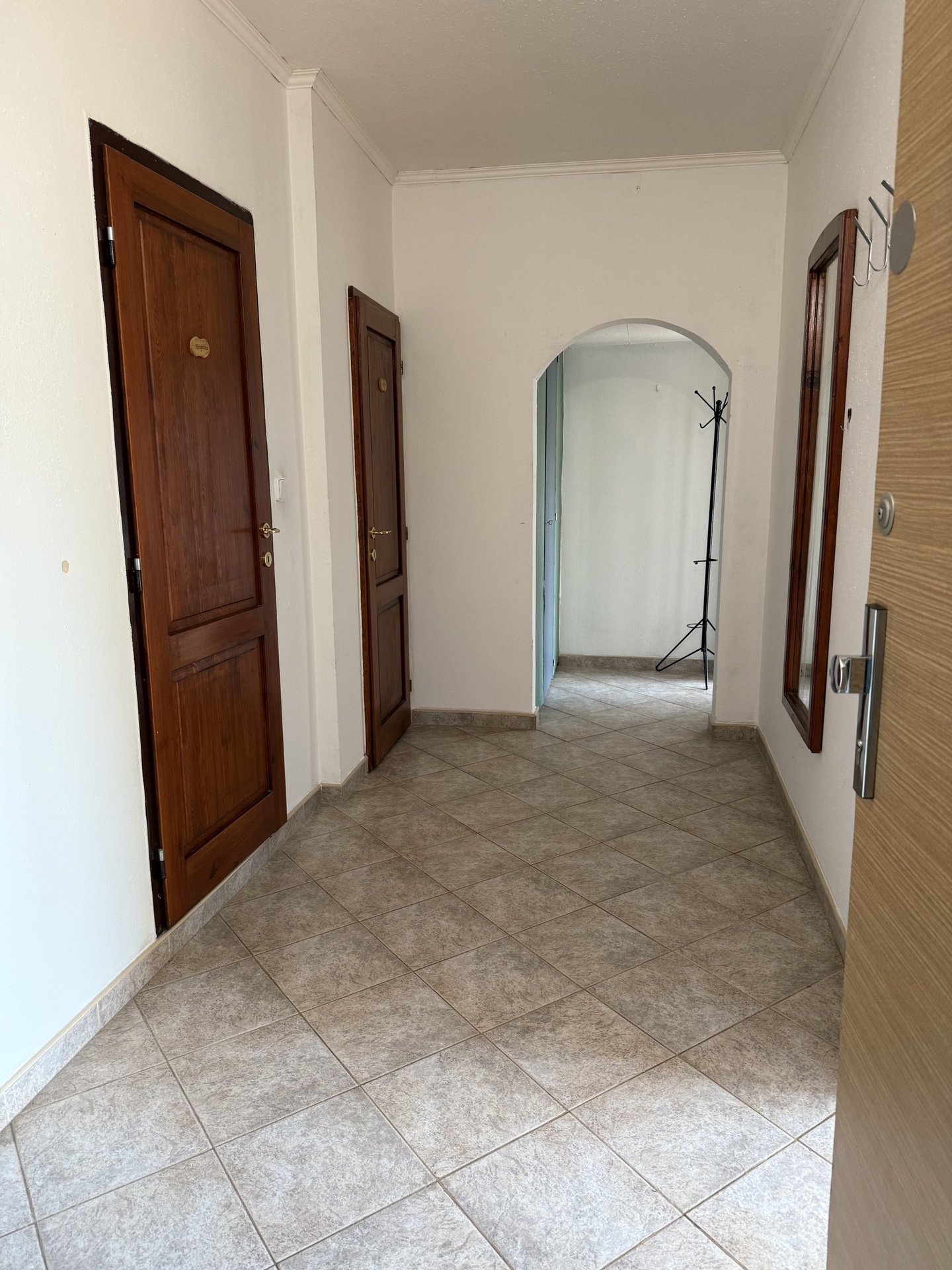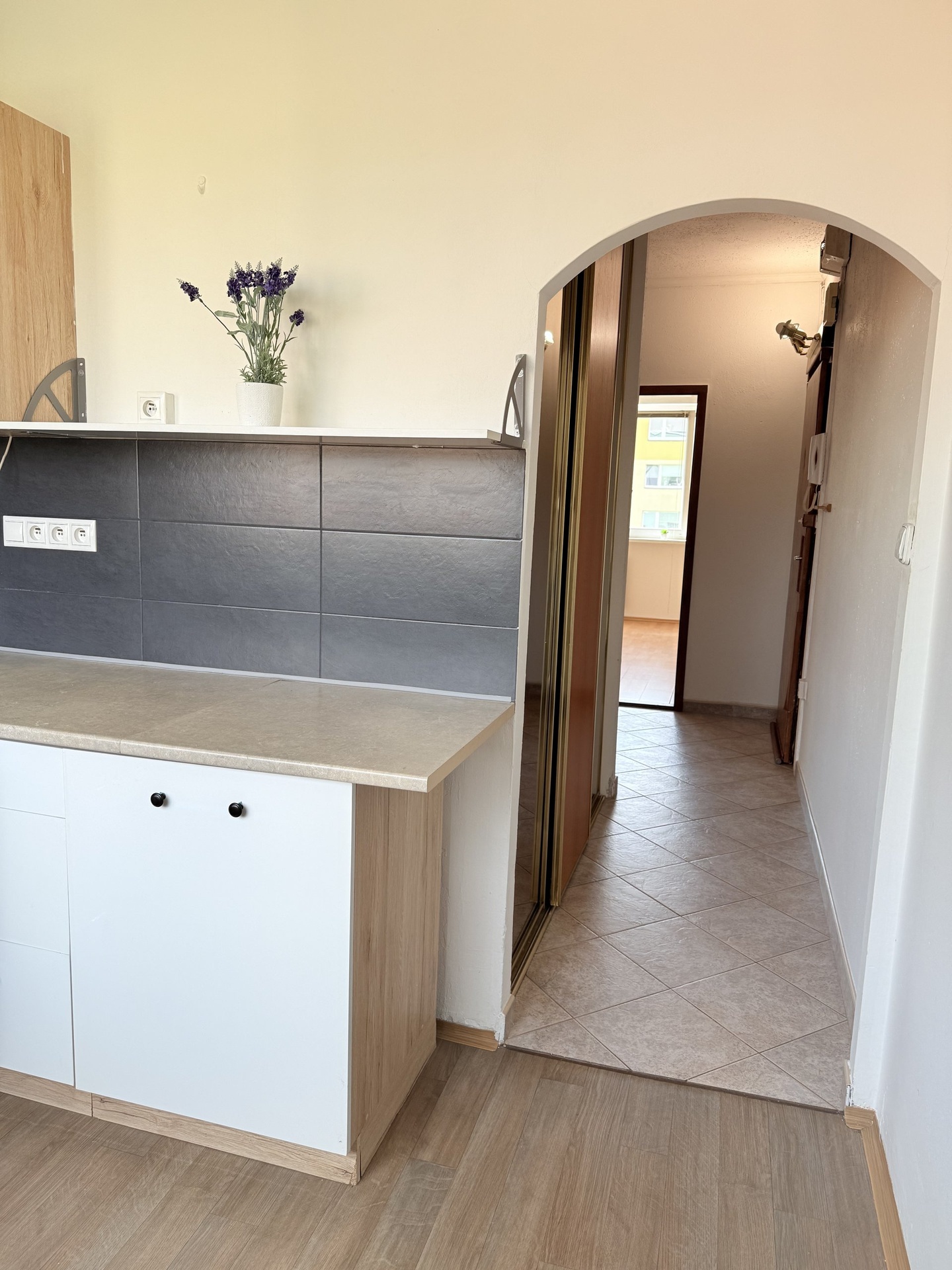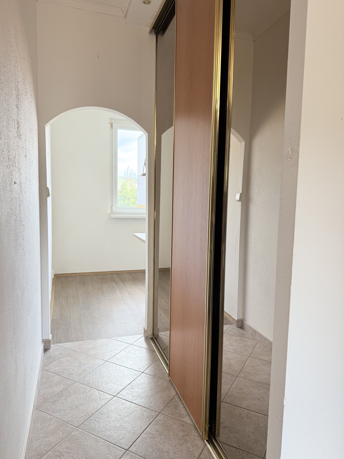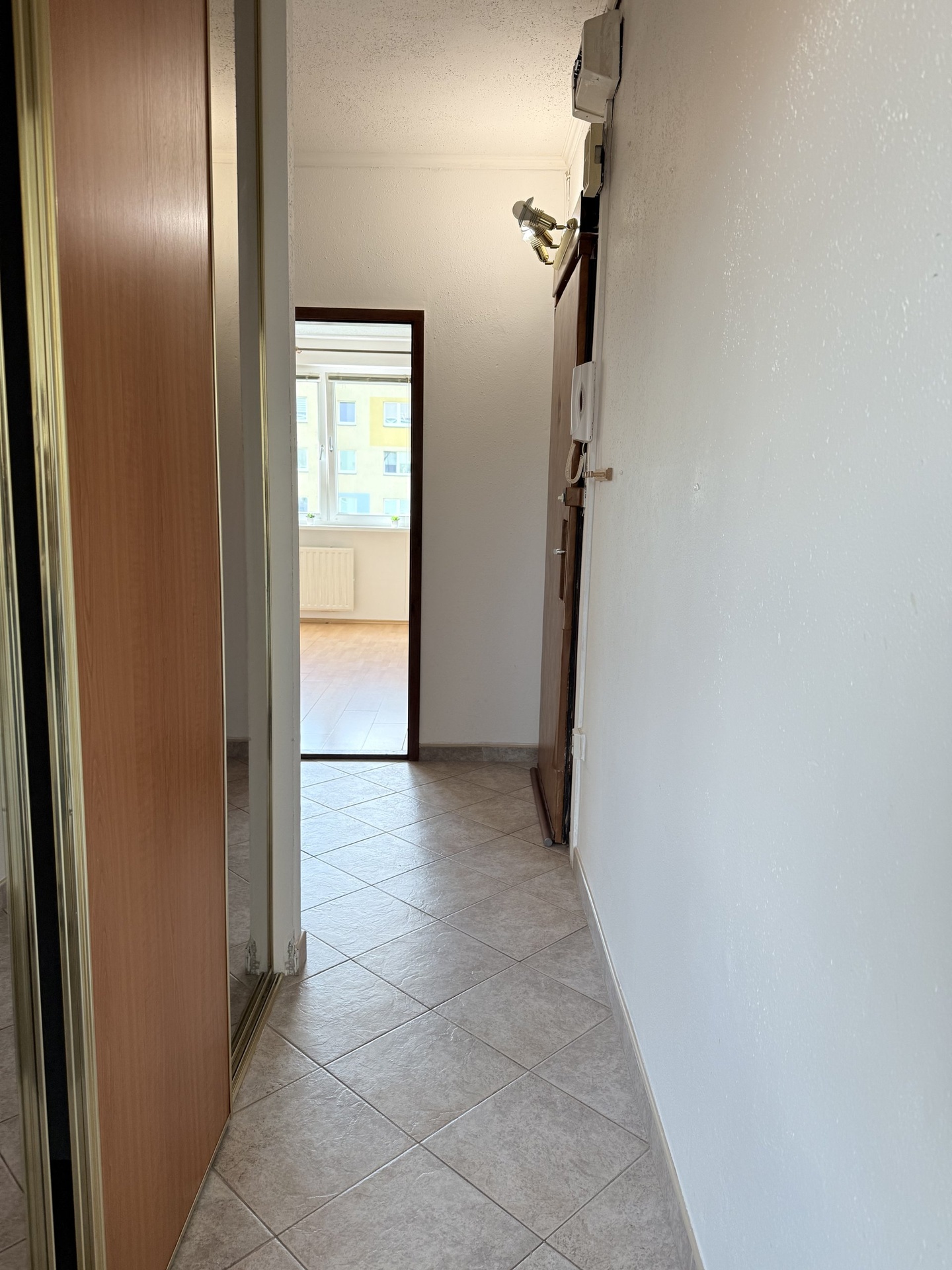 Prostorná předsíň s vestavnými skříněmi a nové domovní dveře.