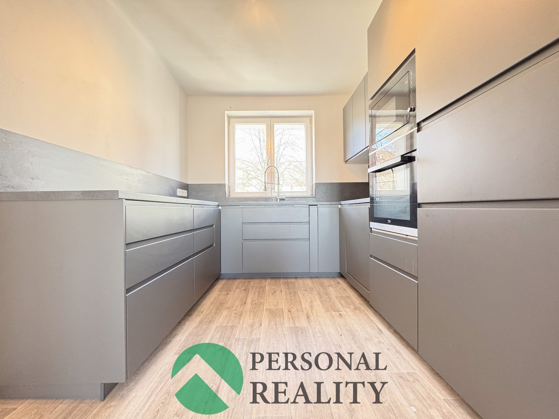 - Prostorná kuchyň s moderní šedou linkou (mat, žádný lesk z devadesátek )