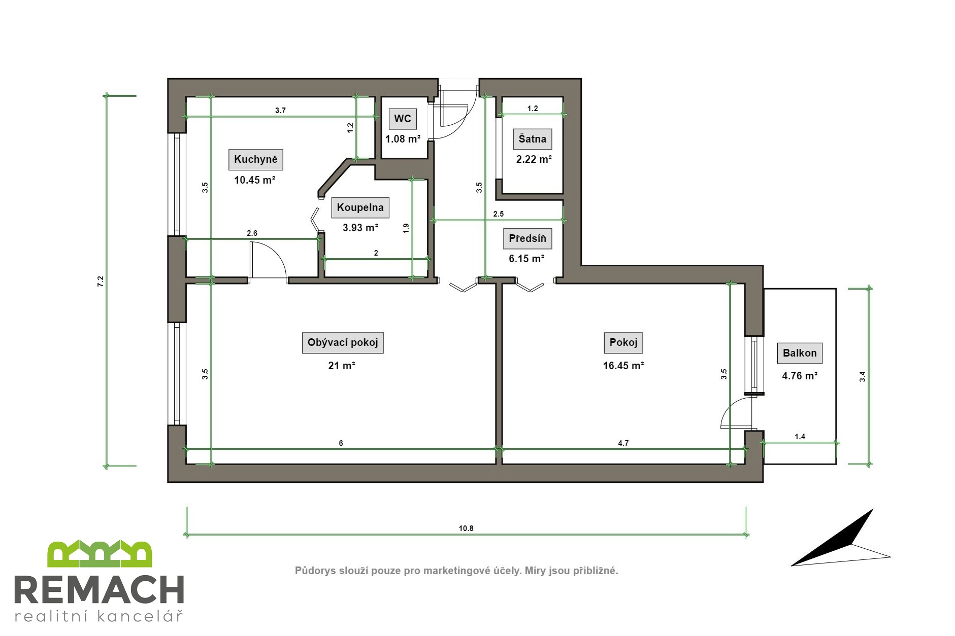 Byt je částečně zařízený, což poskytuje novým nájemníkům flexibilitu v zařizování dle jejich vlastního stylu a potřeb. Kuchyně je vybavena linkou, která nabízí dostatek úložného prostoru a pracovní plochy pro každodenní vaření. Obývací pokoj je prostorný a světlý, ložnice s balkonem s orientací na jižní stranu je ideálním místem pro ranní kávu nebo večerní posezení.