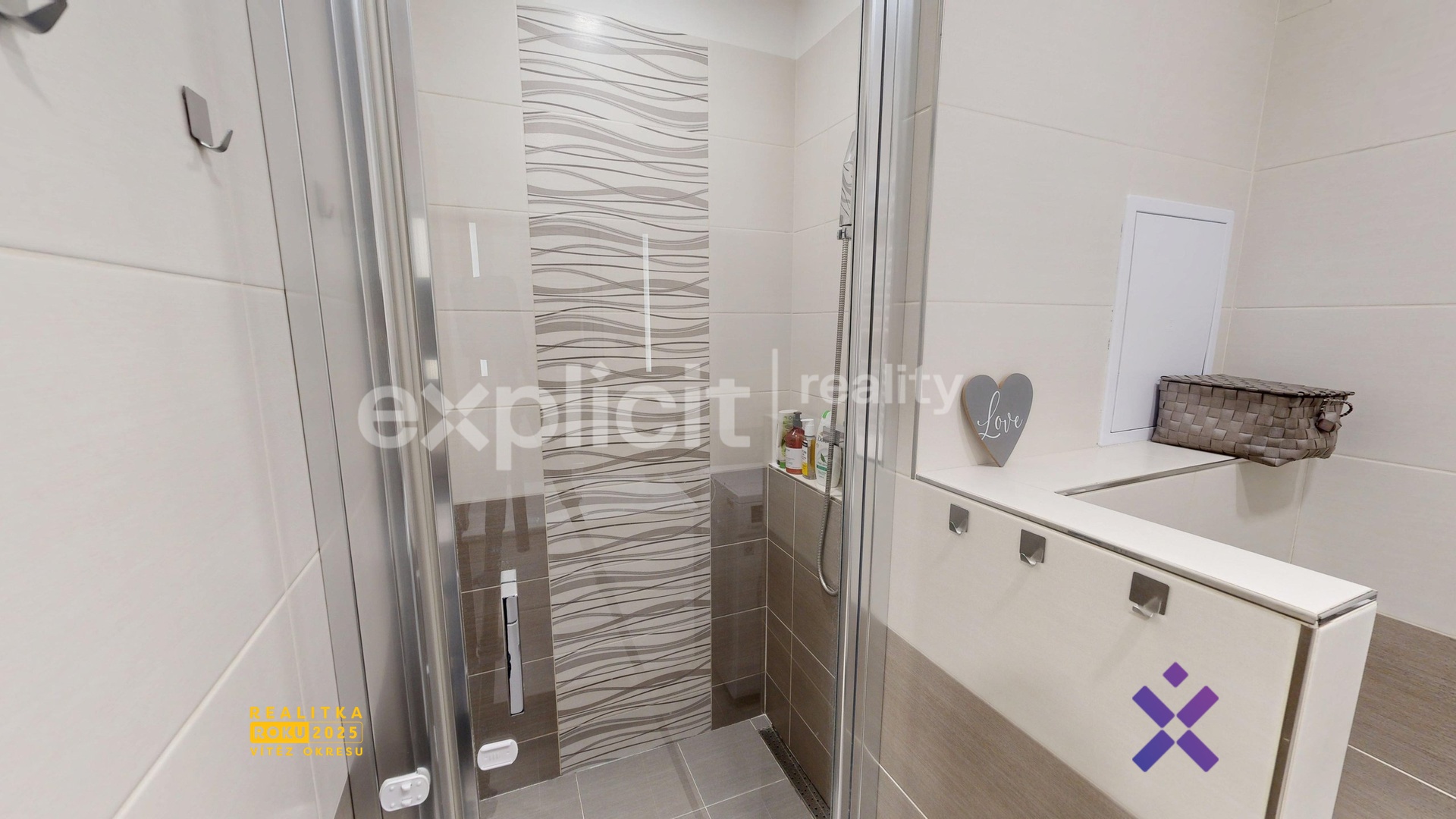 Po levé straně je situována koupelna se sprchovým koutem a topným žebříkem. Koupelna je sloučena s toaletou.