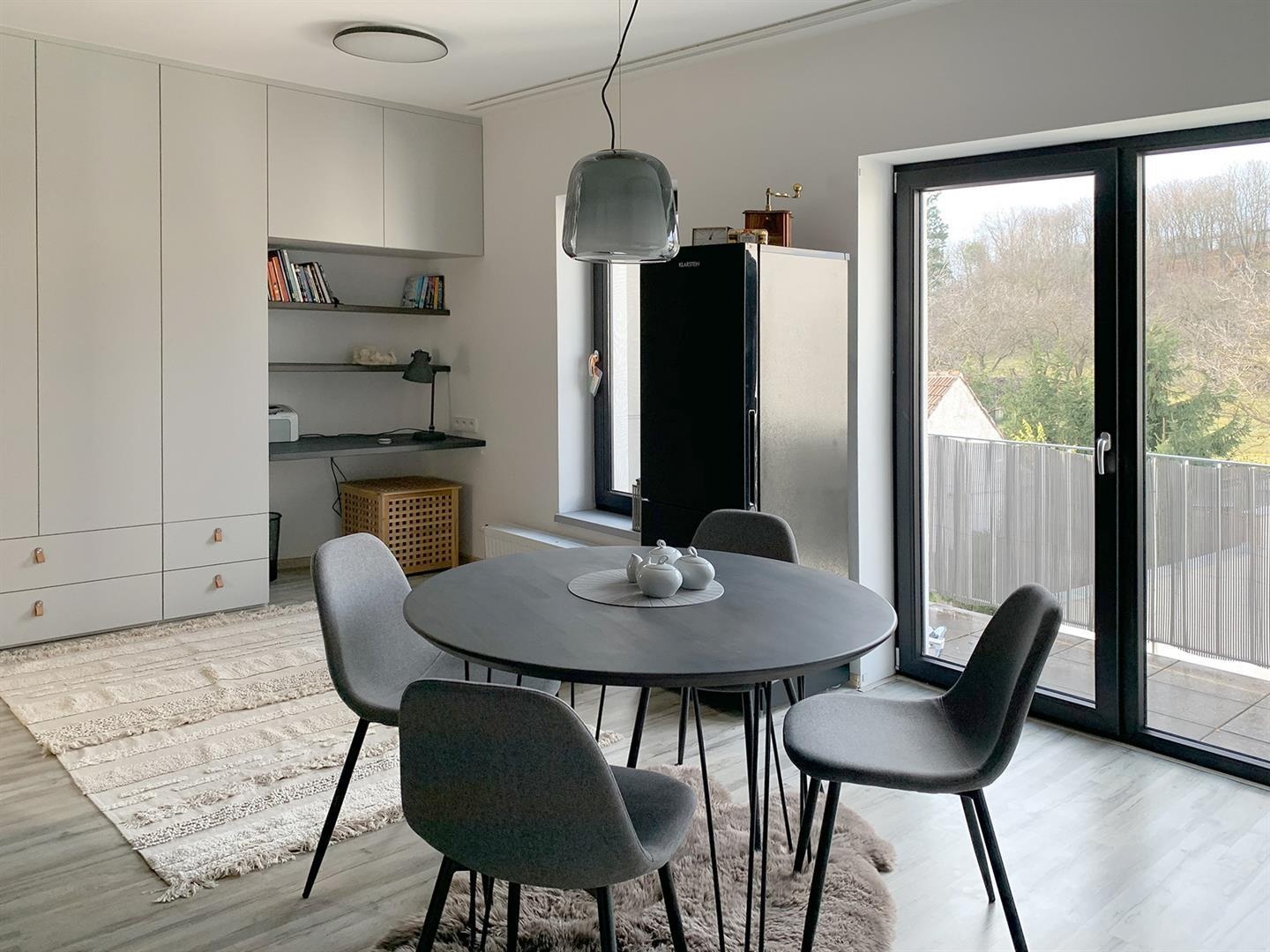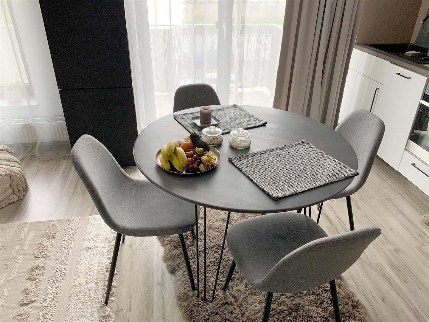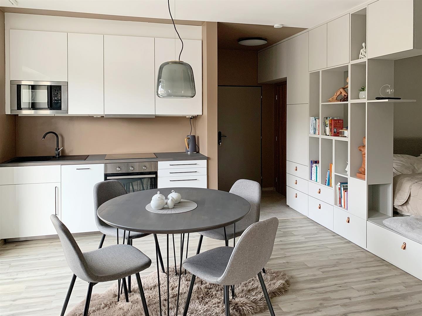 Kuchyňský kout je vybaven na míru dělanou linkou se spotřebiči - varná deska, trouba, lednice s mrazícím boxem, mikrovlnná trouba, digestoř, myčka a jídelním stolem s židlemi. Z této části pokoje je vstup na prostorný balkon o velikosti 5m2, který je orientovaný na západ.