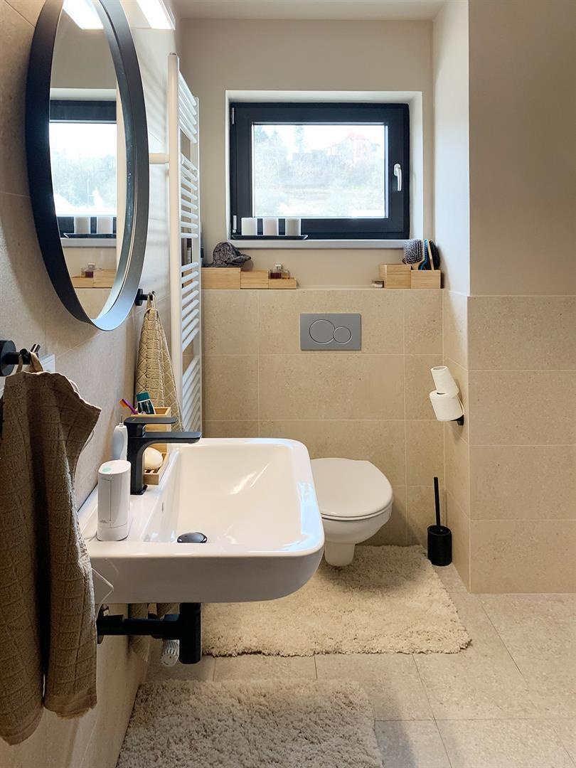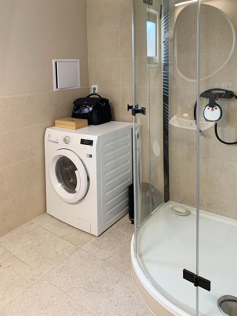 Koupelna je vybavena sprchovým koutem, umyvadlem, pračkou a toaletou.